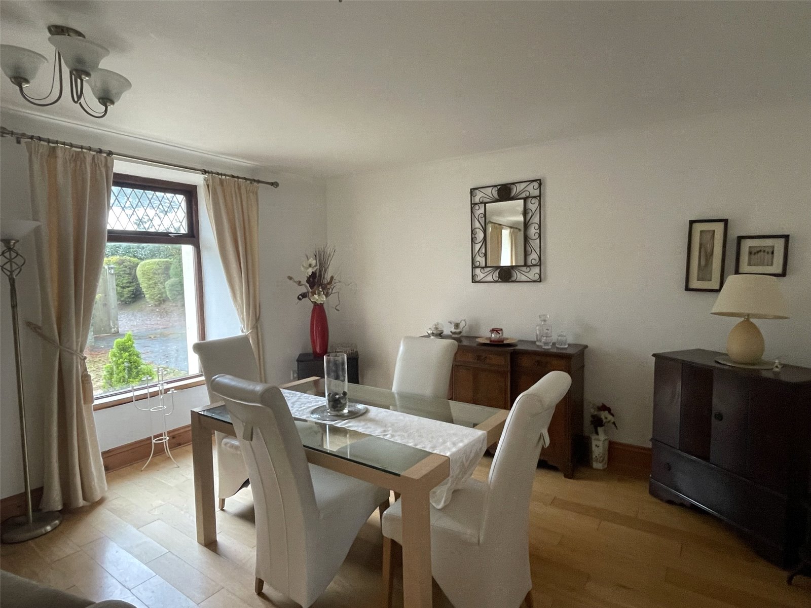 Continuing with the slate flooring into the dining room there is a wall mounted electric fire, access to utility area, ceiling spot lights, radiator, patio doors onto another patio area.