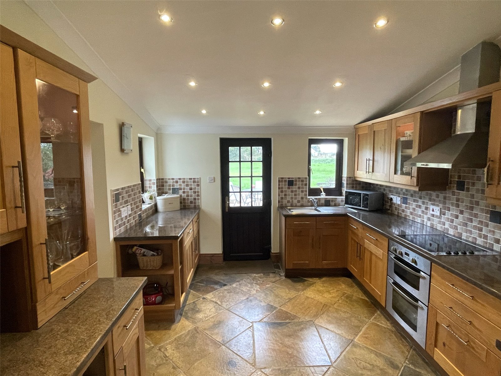 Slate flooring, a range of base and wall units, sink and drainer with mixer tap, integrated oven and hob with overhead extractor fan, ceiling spot lights. Double glazed window and uPVC double glazed door onto patio. Open plan leading to :