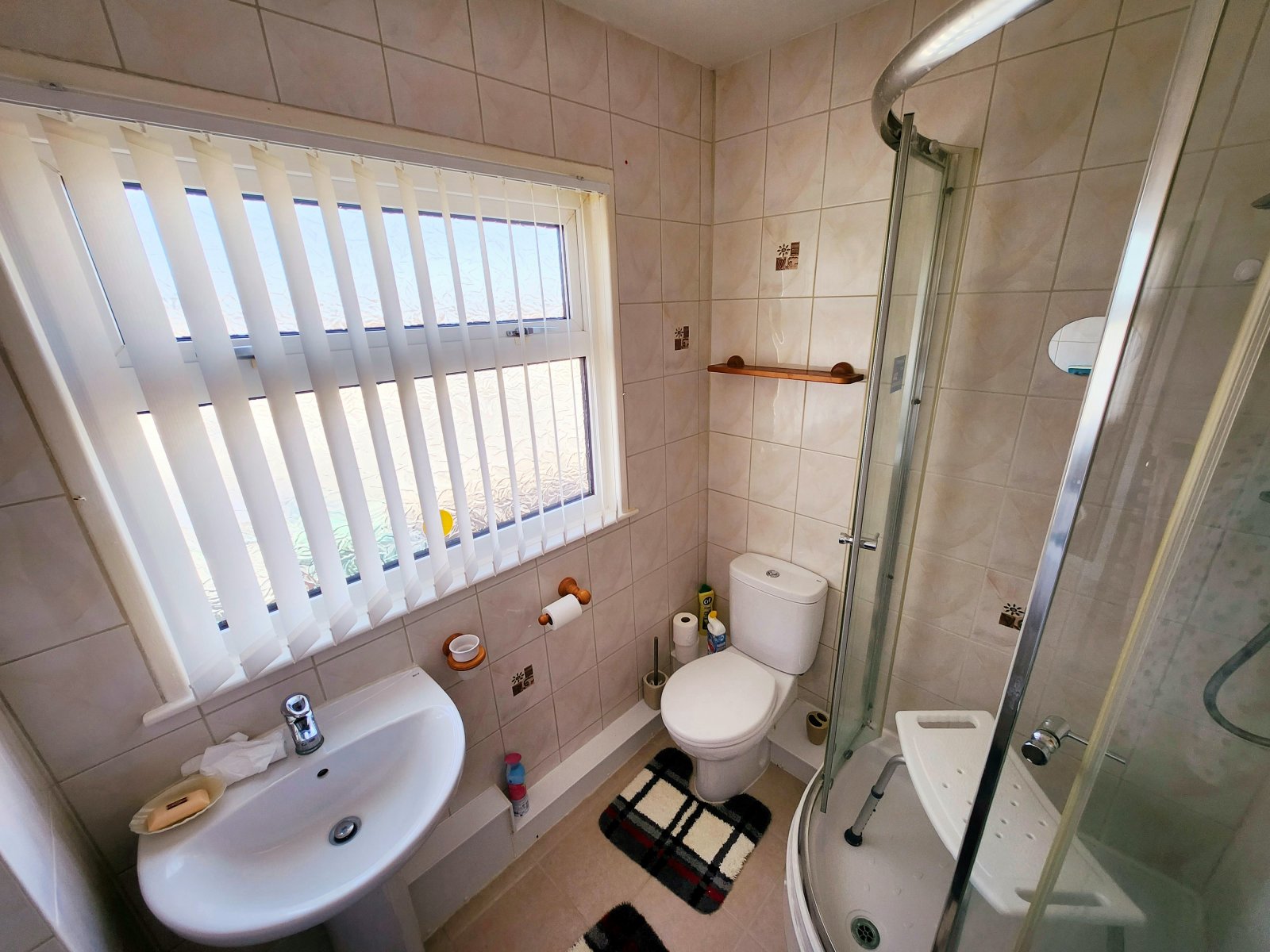 Tiled floor, chrome towel radiator, uPVC window with obscure glass to rear, corner shower enclosure with thermastatic shower, wash hand basin with chome mixer tap, low level toilet, floor to celing tilled walls, light fitting