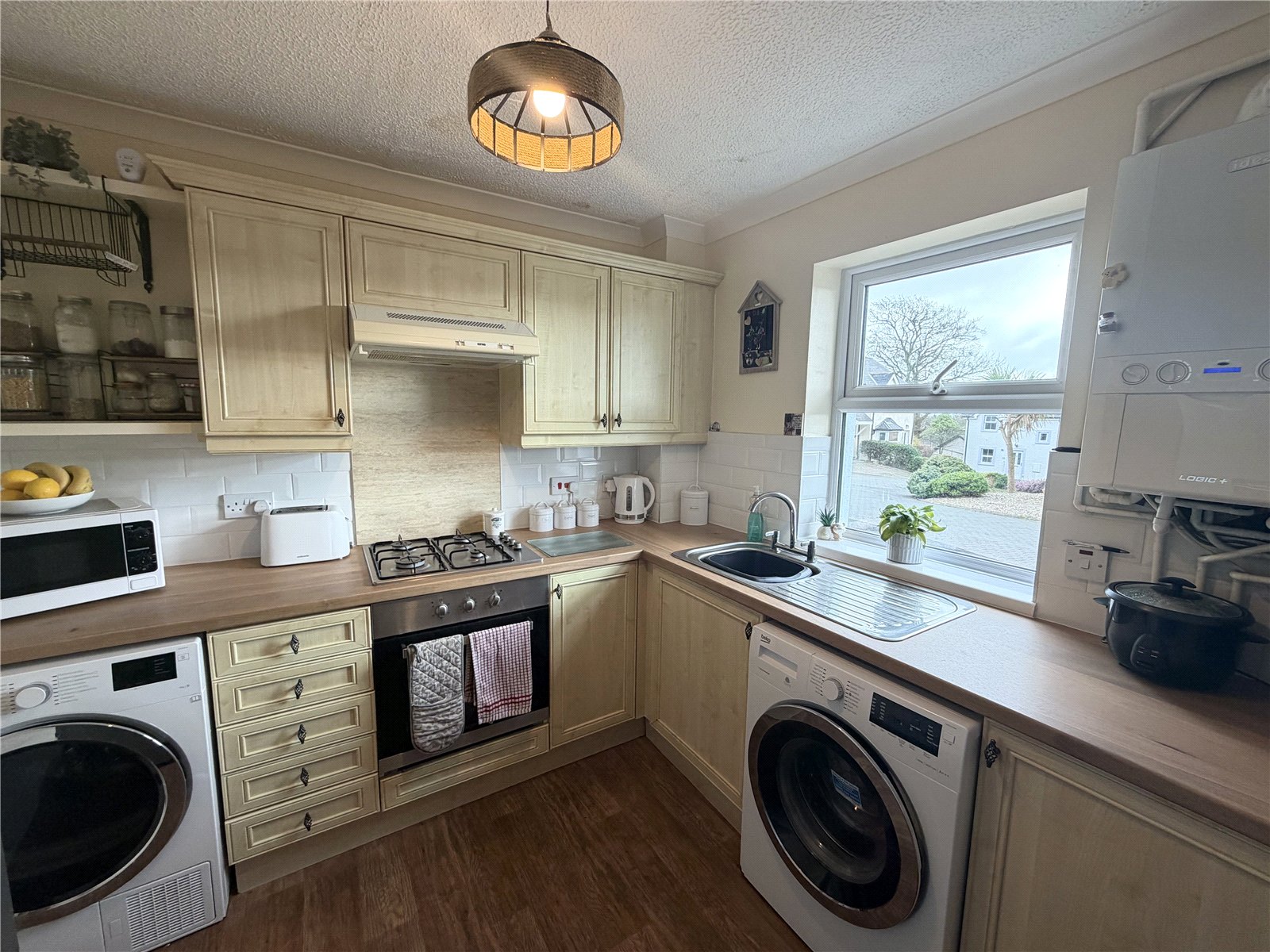 Wall and base mounted units with oak-effect worktops over. Double glazed window overlooking the front aspect. Vinyl flooring and white tiled splashback. Stainless steel sink and drainer with mixer tap. Integrated oven with gas hob and extractor fan over. Space and plumbing for washing machine and space for tumble dryer.