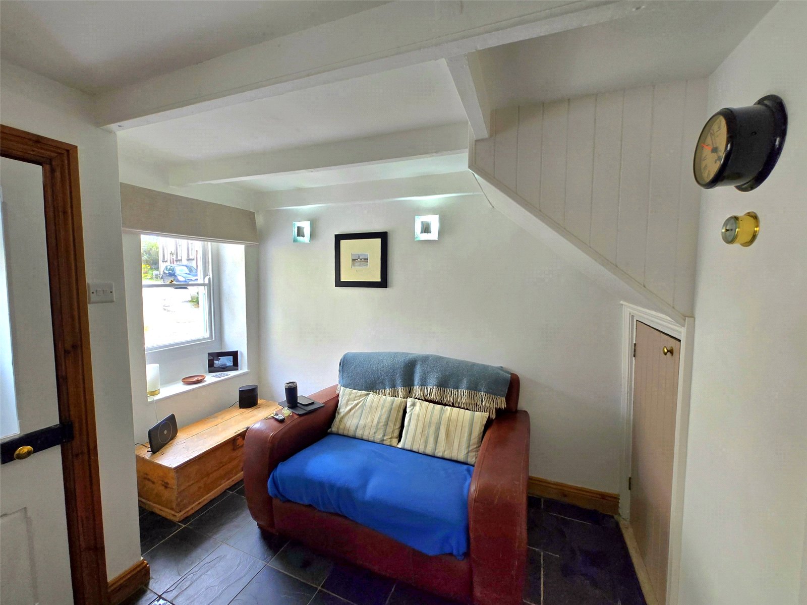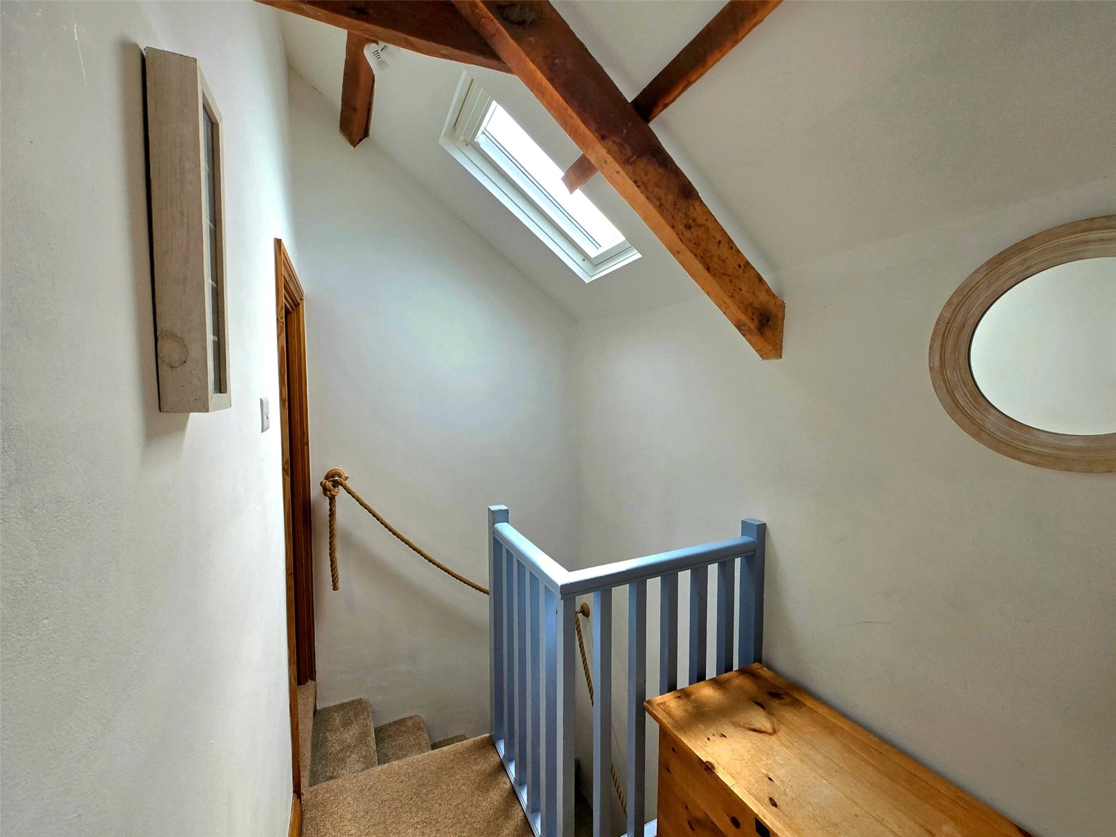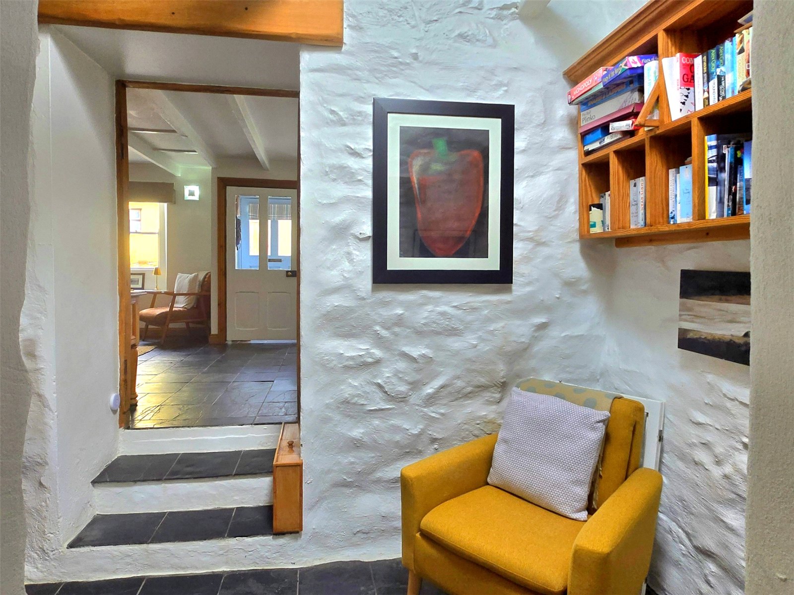 Library cove, exposed oak beams obove, natural slate flooring, double-glazed velux skylight, double-glazed window to rear elevation, recessed storage cupboard with eave storage above, quality render finish over original stone walls. Furnished with eye-level bookshelf.