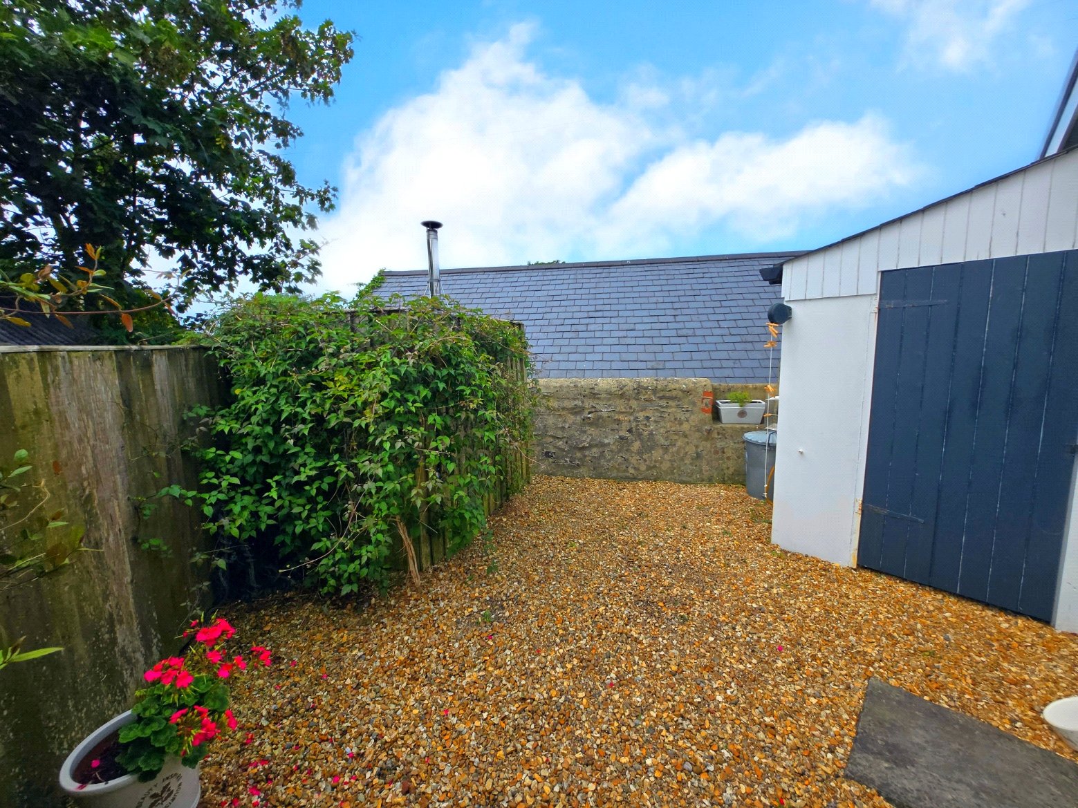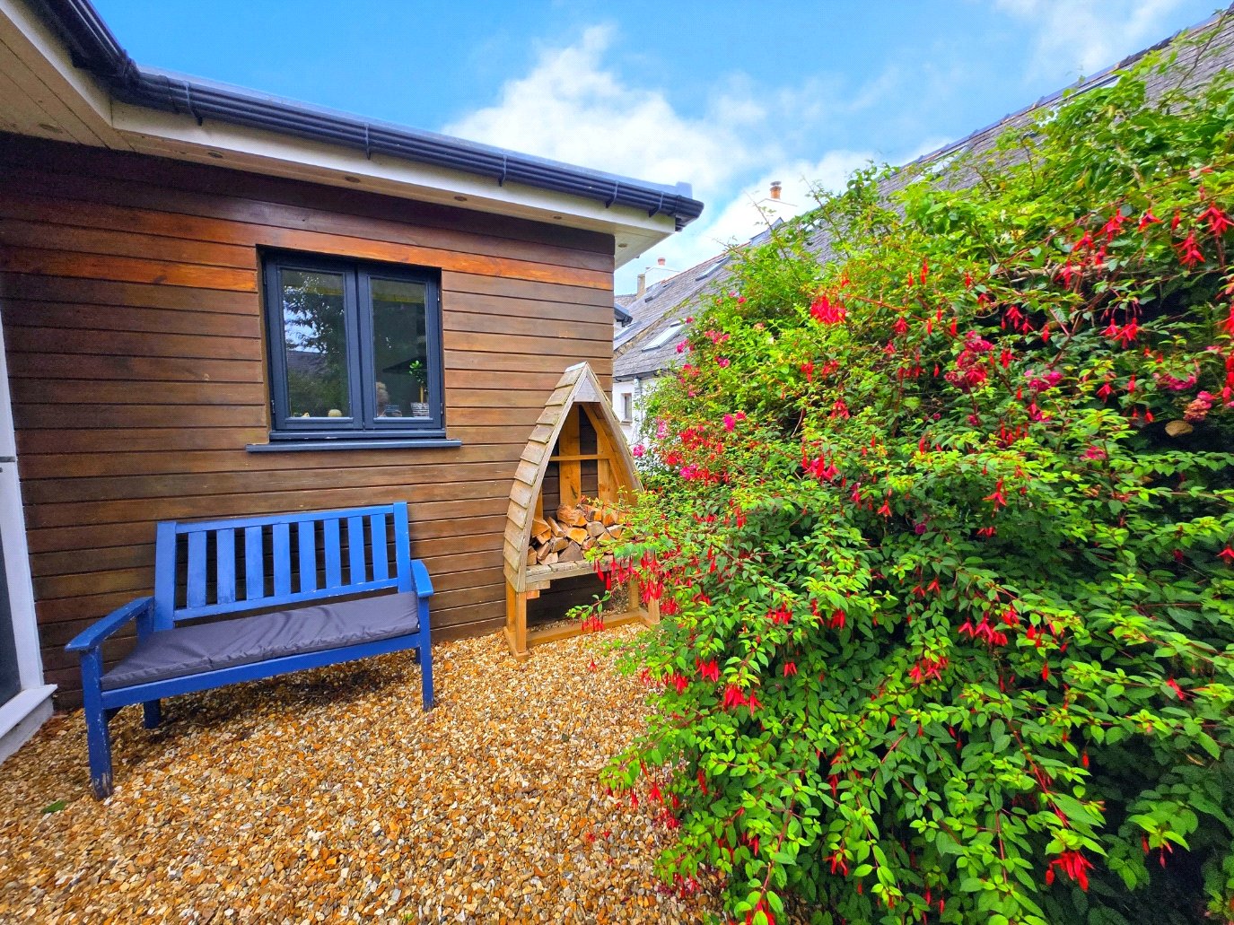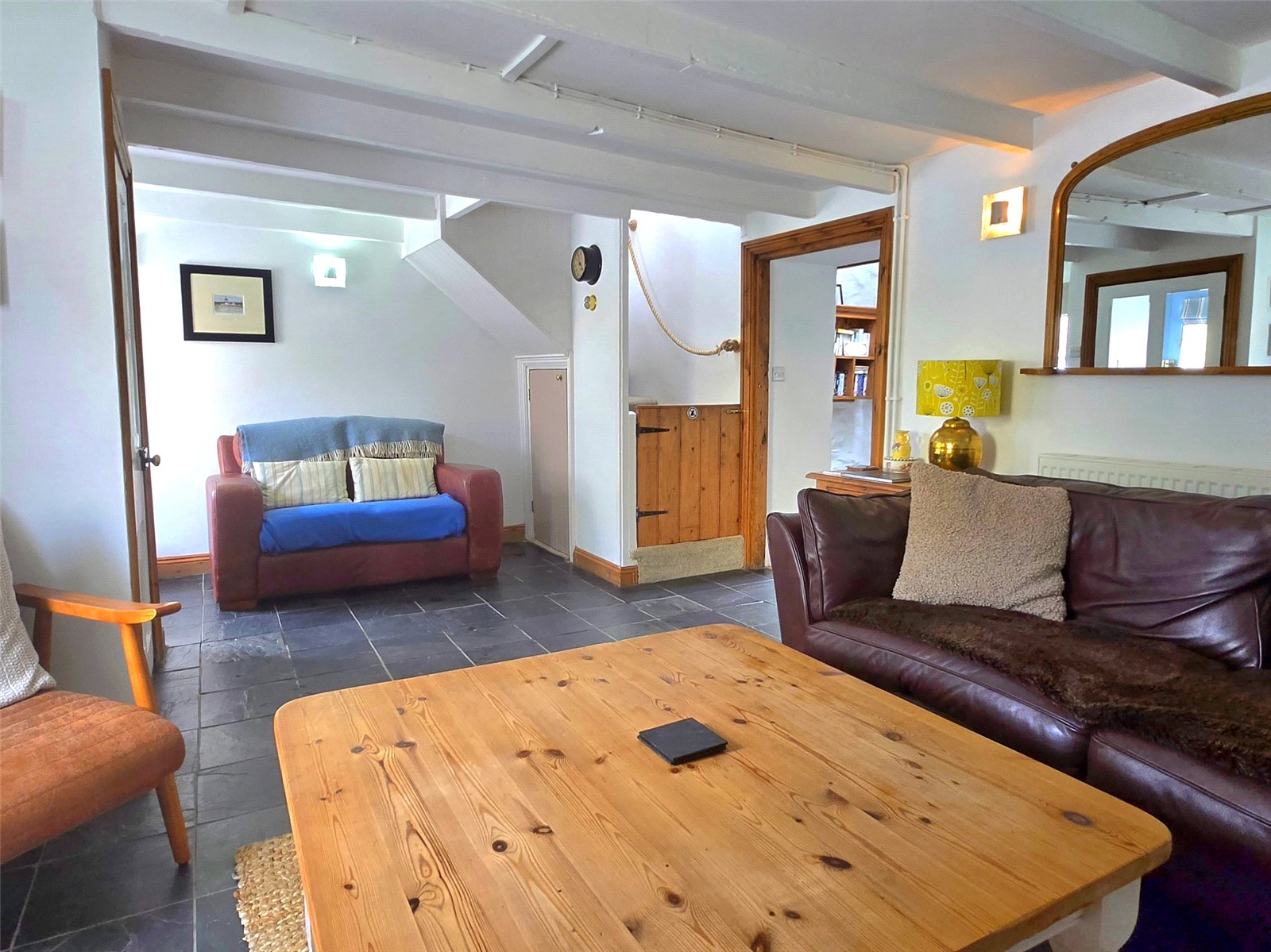 Library cove, exposed oak beams obove, natural slate flooring, double-glazed velux skylight, double-glazed window to rear elevation, recessed storage cupboard with eave storage above, quality render finish over original stone walls. Furnished with eye-level bookshelf.