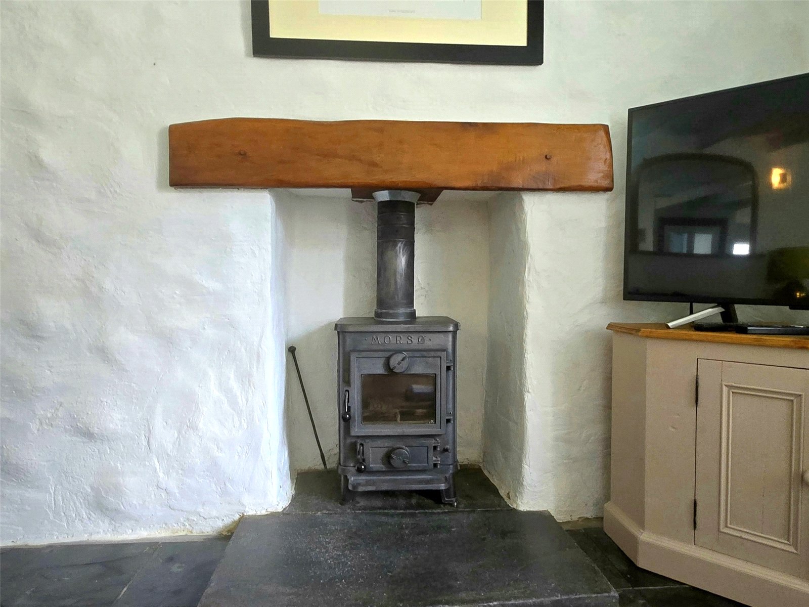 A spacious lounge with a cosy feel. Briefly comprising slate flooring throughout, fire place with slate hearth and oak mantel, wood burner within, as well as recessed wood store, exposed wooden beams to ceiling, sash windows overlooking the front elevation, feature wall with quality render finish over original stone.