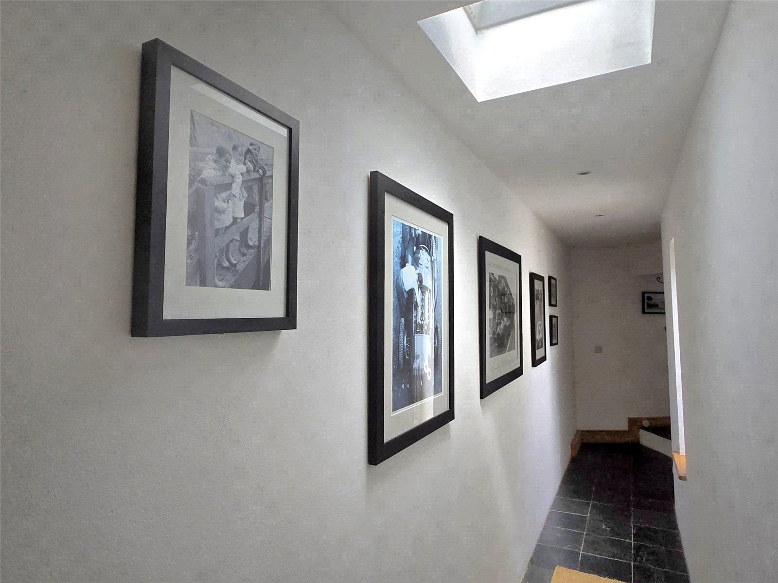 Light and airy hallway, with natural slate flooring tiles and spotlighting & skylight above.