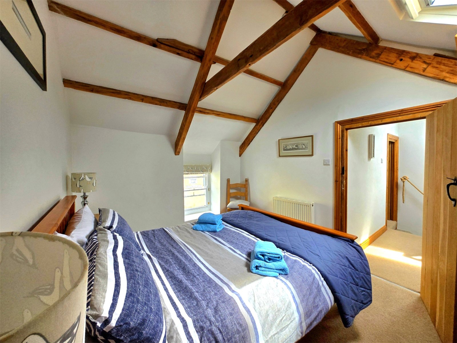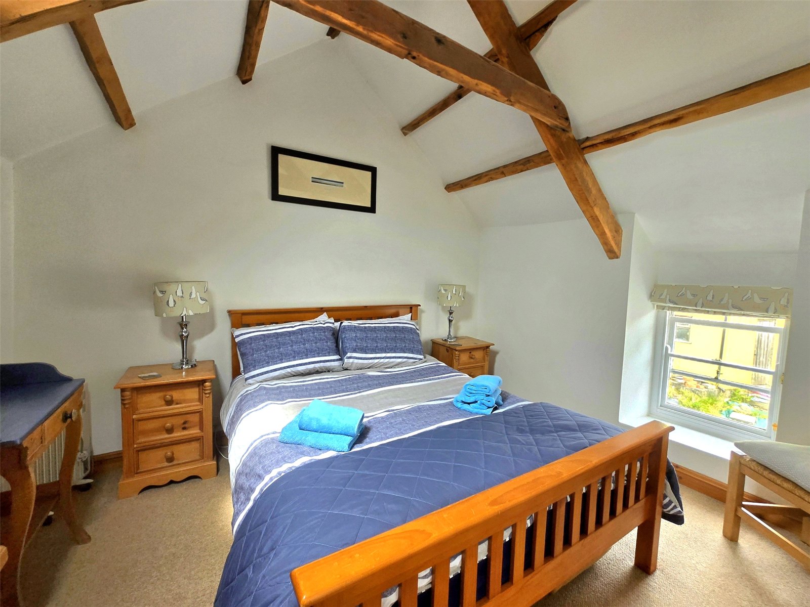 Rustic solid wood door, leading into a bright and modern bedroom. Current owners utilise a pull-out trundle bed to allow sleeping for two. Exposed wooden A-framing to the ceiling, with sash window to the front. Carpeted throughout and spotlighted above.