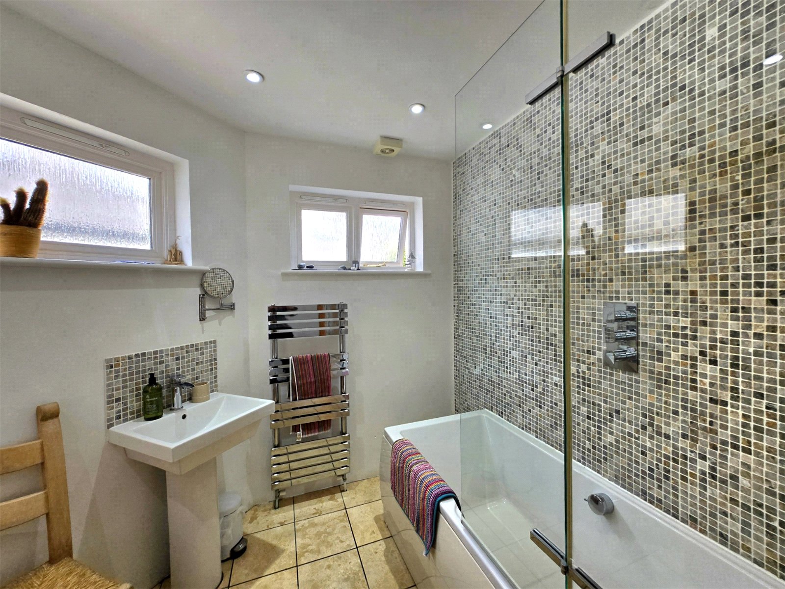 Modern bathroom, with bath & overhead shower, tiled surround, wash basin with waterfall mixer tap, close-coupled w/c, tiled flooring, spotlighting and heated towel rail.