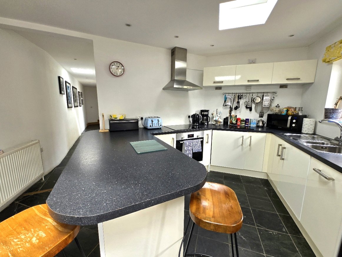 Spacious kitchen/diner, with the kitchen area comprising a range of modern base & wall units, breakfast bar, integrated dishwasher, oven & ceramic hob unit with overhead stainless steel extractor hood. Stainless steel sink and drainer with mixer tap. Base unit space and plumbing for washing machine.