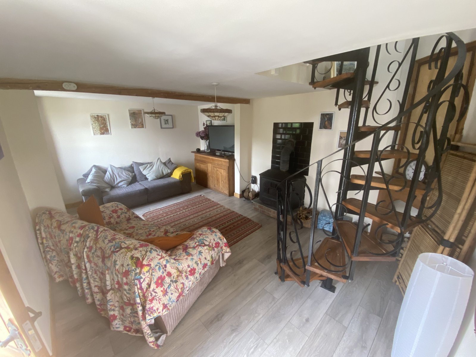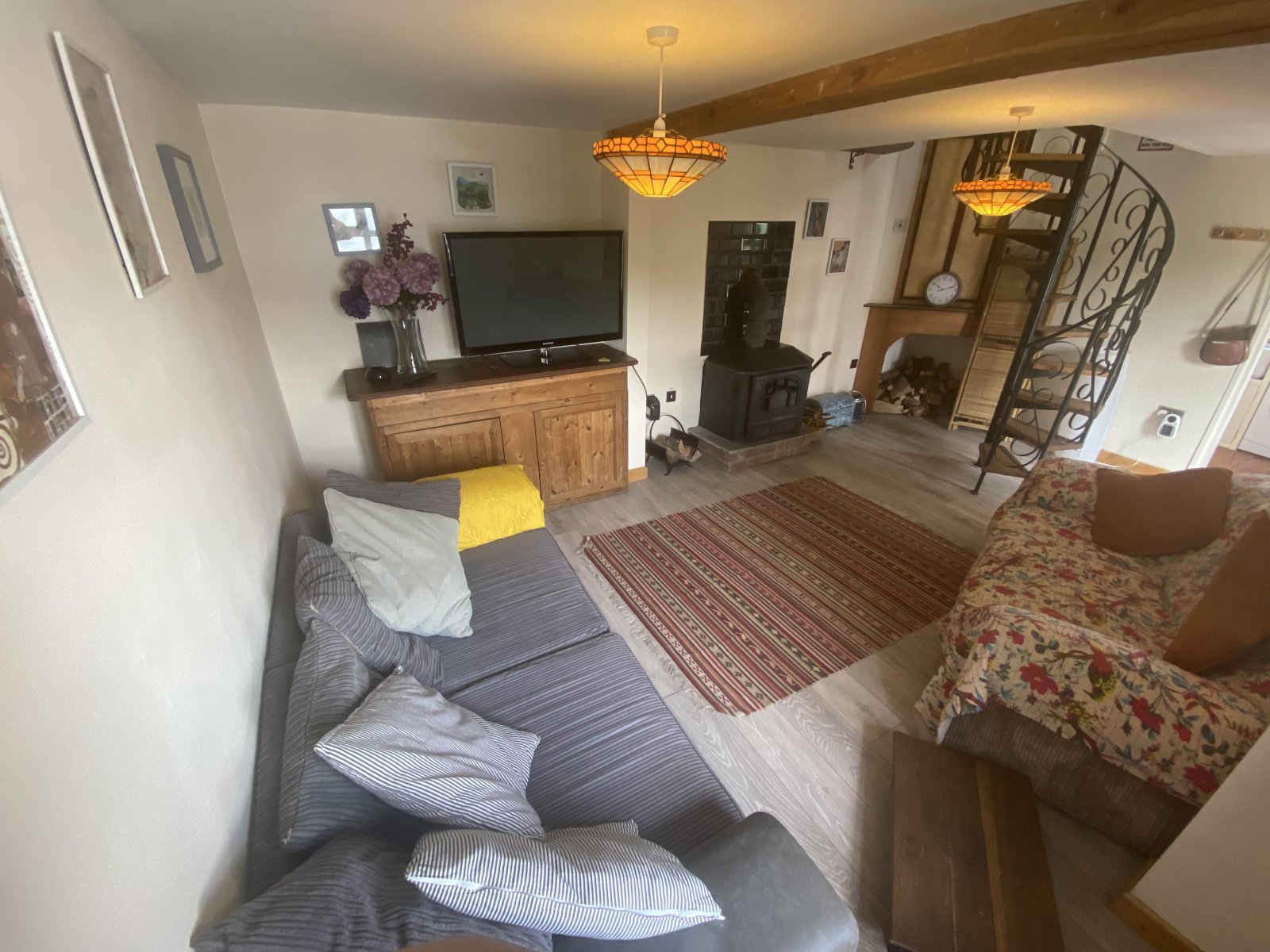 Good size living room with a solid fuel burner & hearth, laminate flooring throughout, light fittings, Spiral staircase leading up to the first floor.