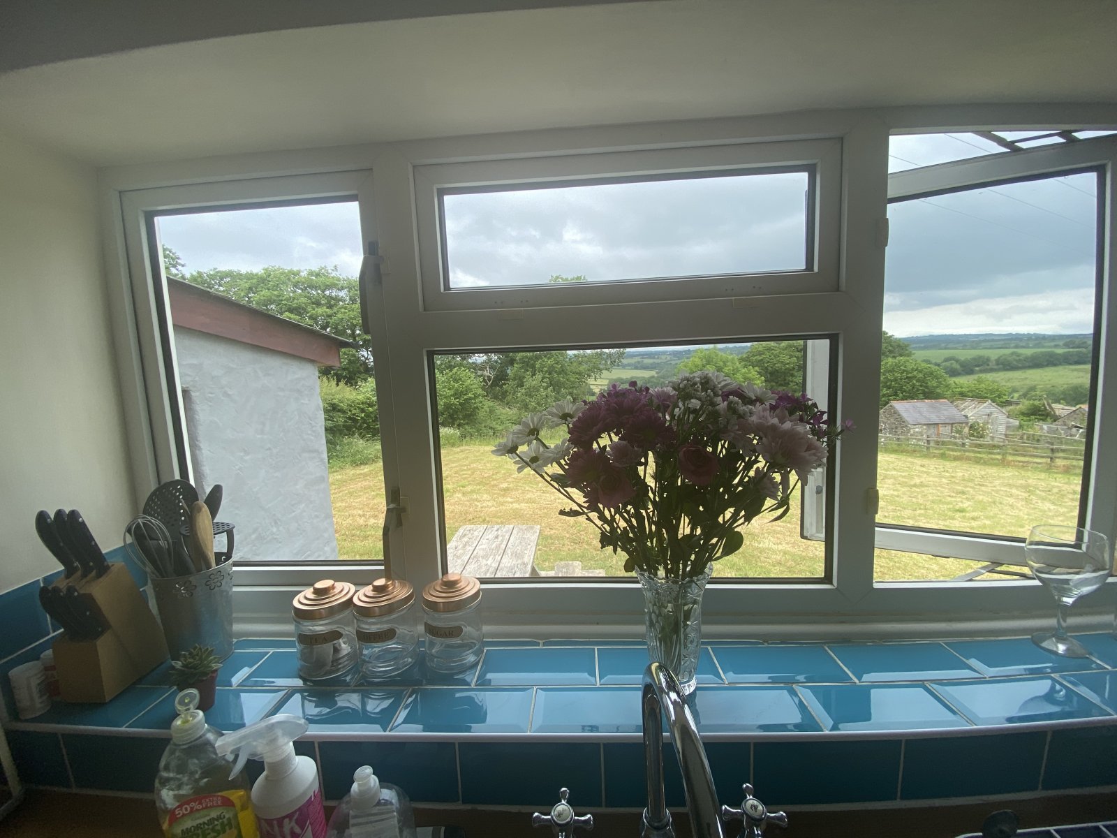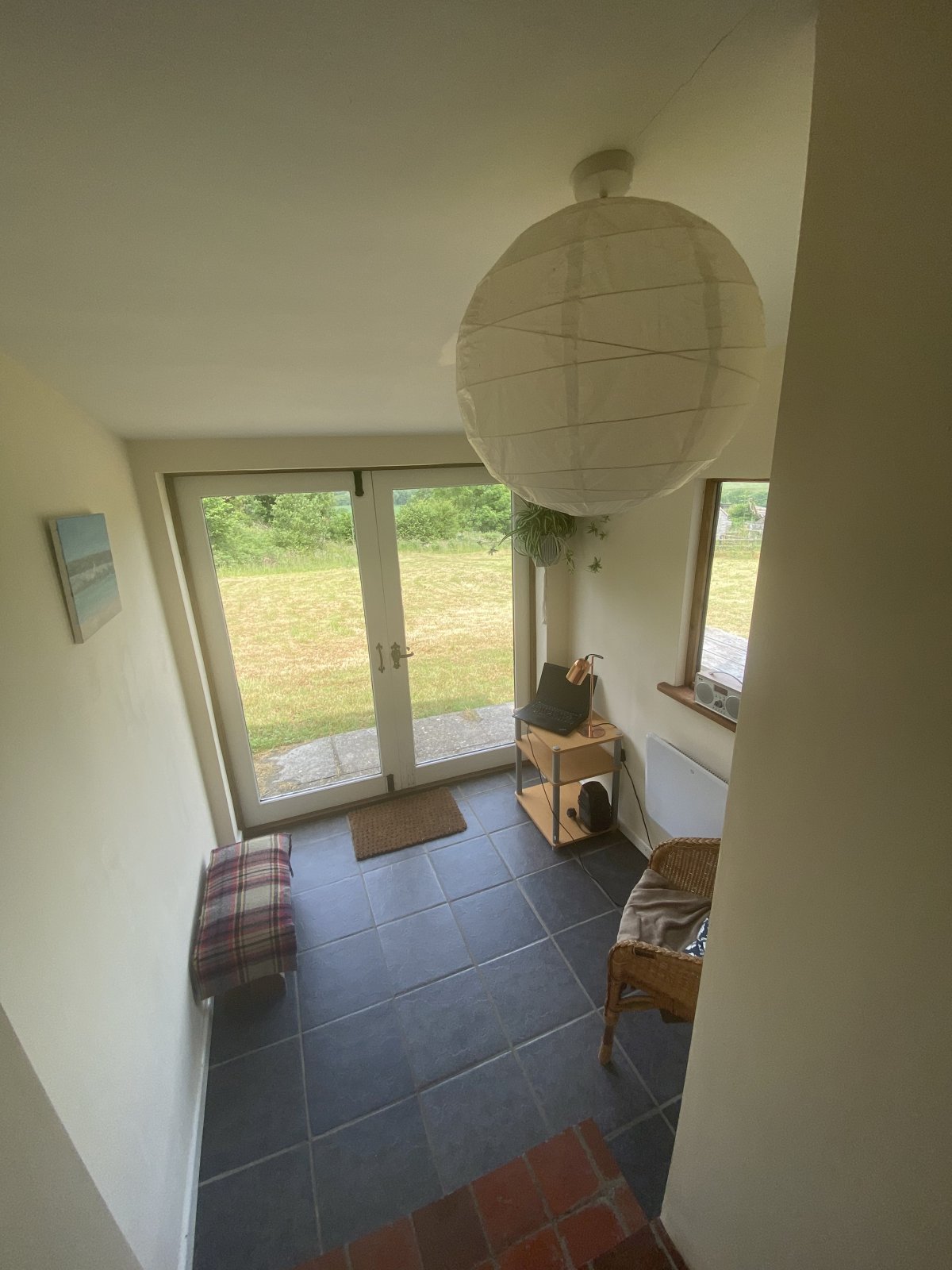Tiled floor, doors leading on to garden, window unit, light fitting.