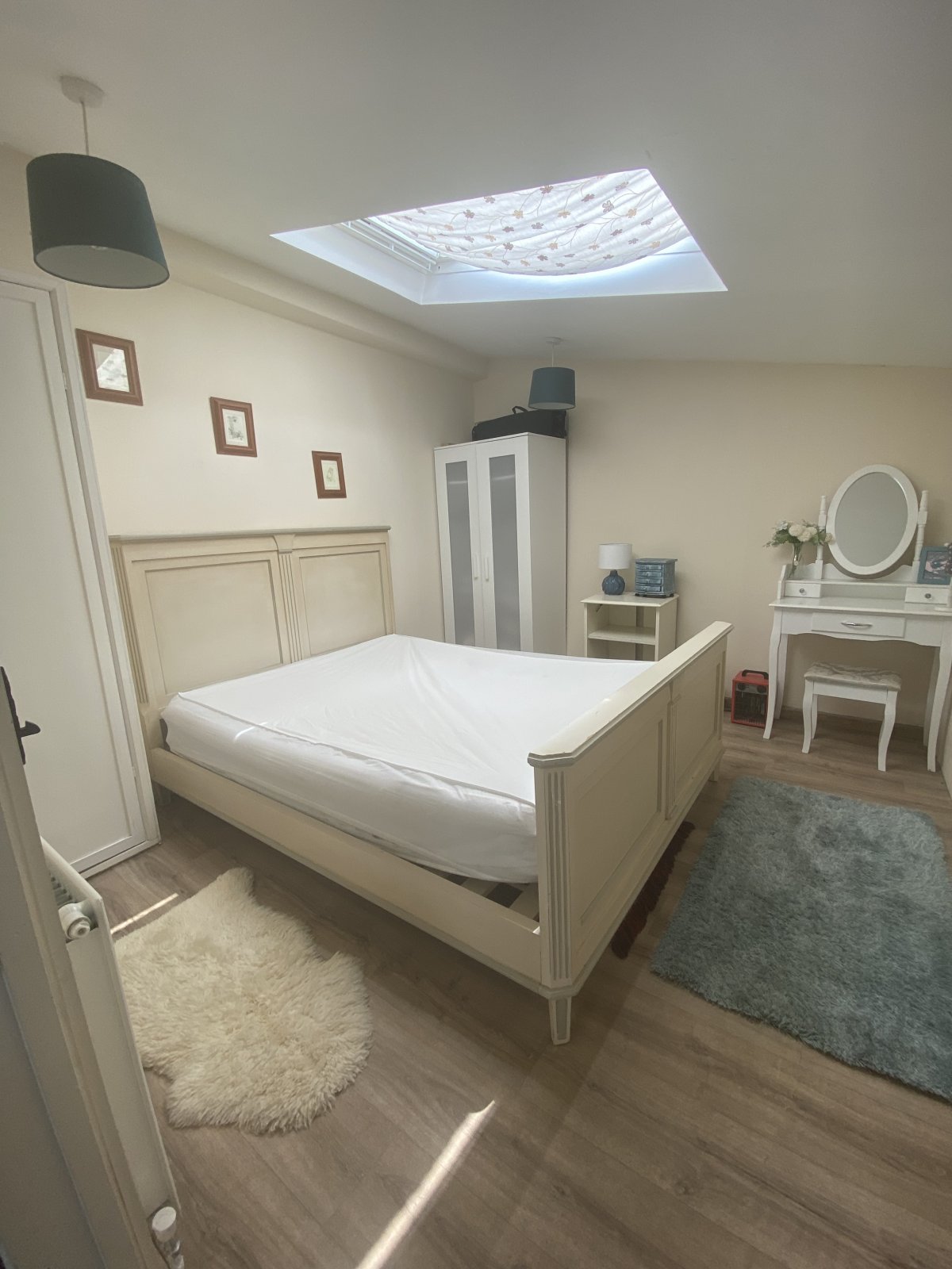 Laminate flooring, light fitting, ceiling skylight, electric sockets, radiator.