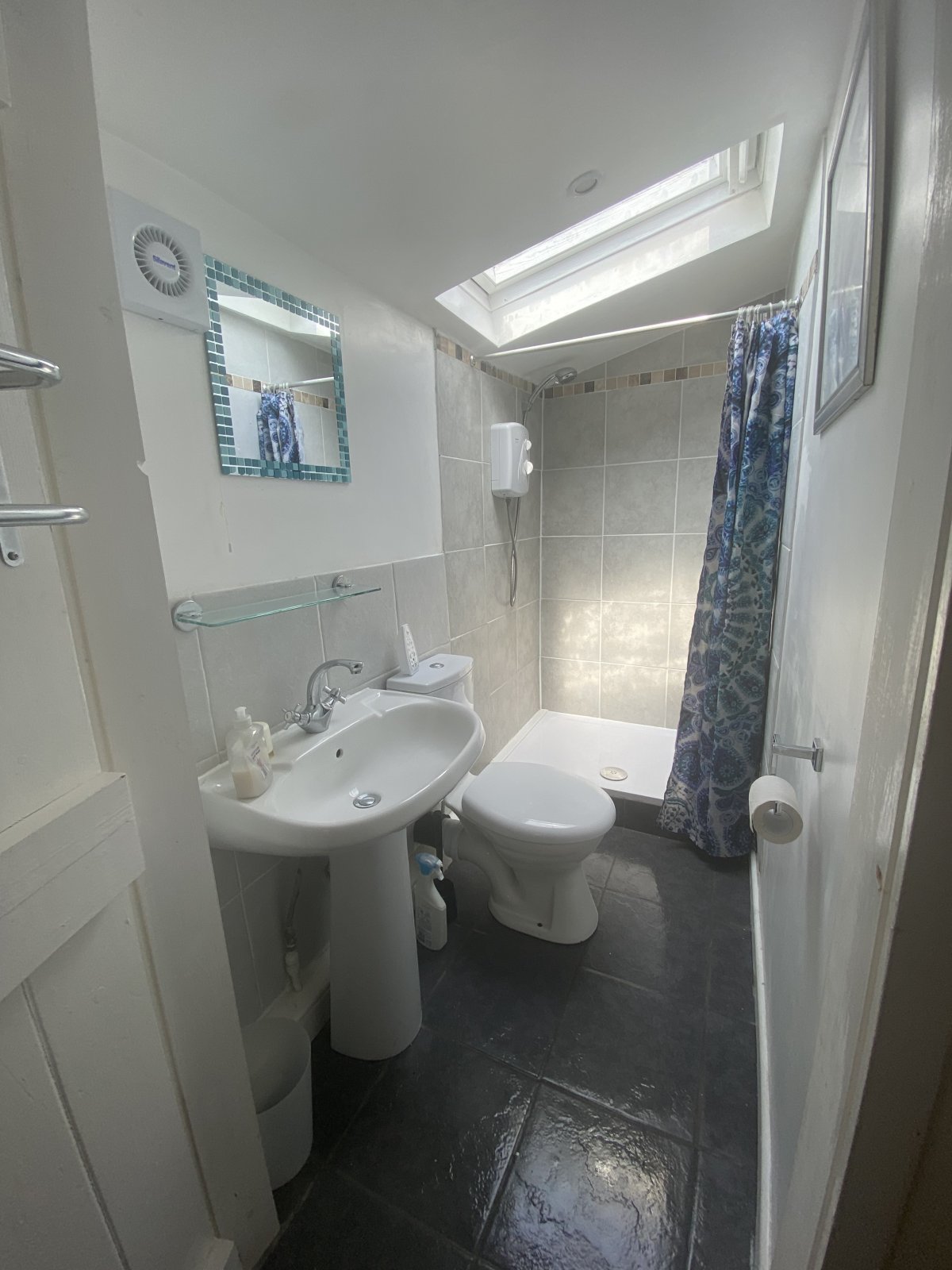 light fitting, tiled floor,velux window, white suite - WH basin,W.C. walk in shower