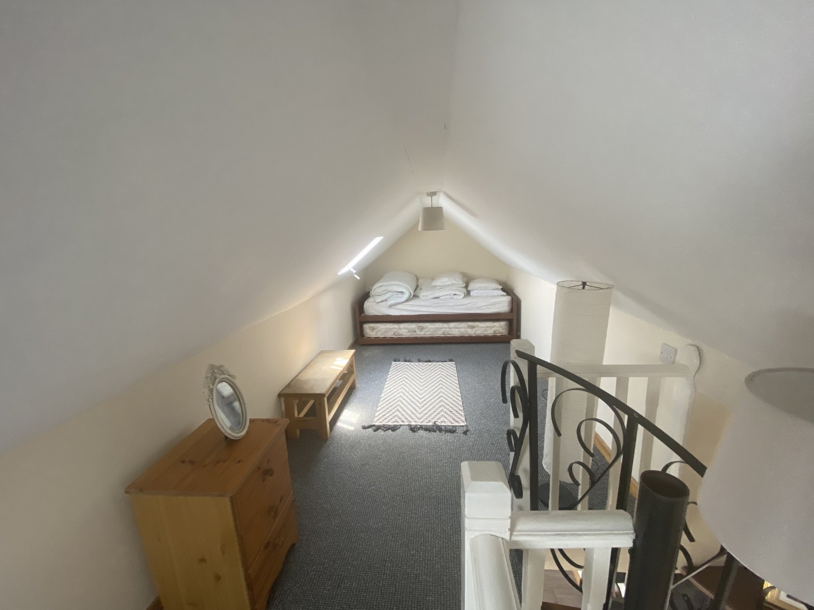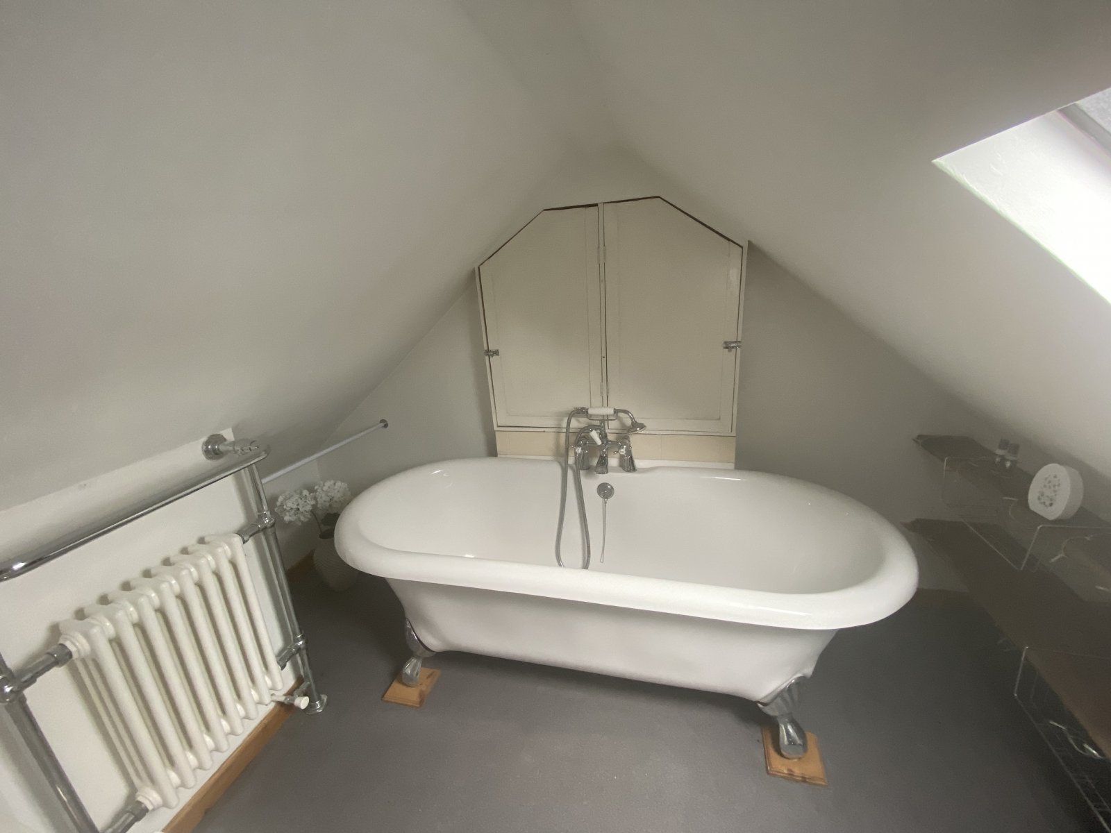 The spiral staicase from the living room takes you up to bedroom 2 which is a double room, 2 velux windows,light fitting, cast iron bath, heated towel rail, shelving, vinyl flooring by bath, carpet in the bedroom area.