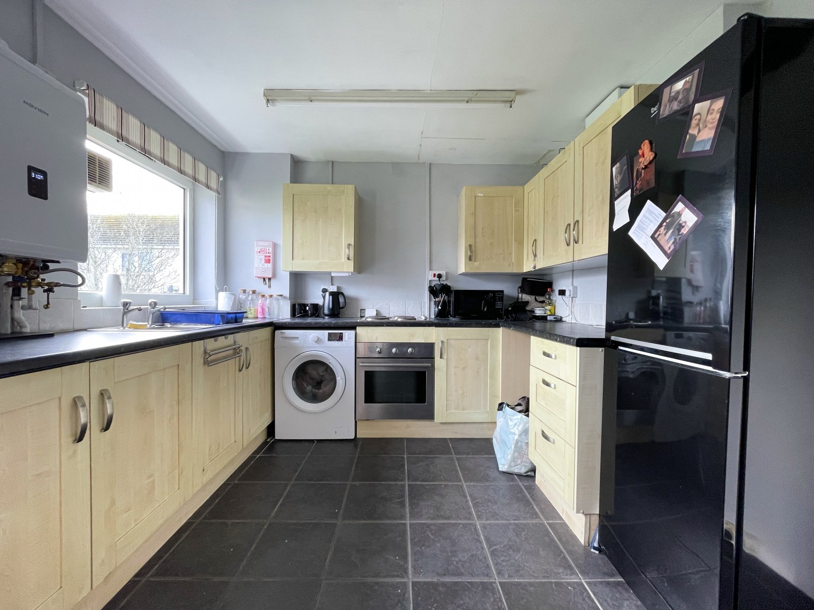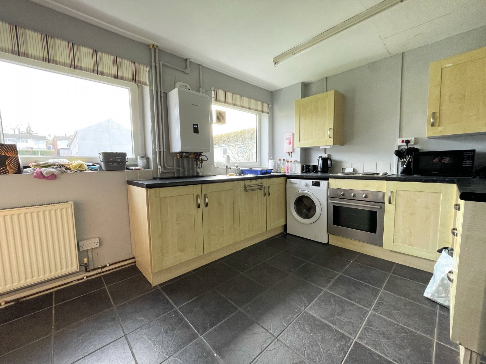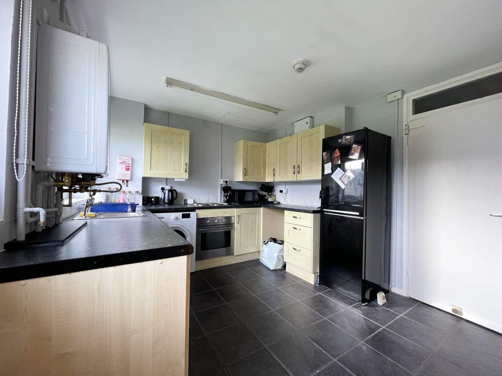 Tiled flooring, range of base and eye level units, integrated hob and oven, fridge freezer, washng machine, space for tumble dryer, boiler, access to balcony, radiator, 2x double glazed uPVC windows to rear.