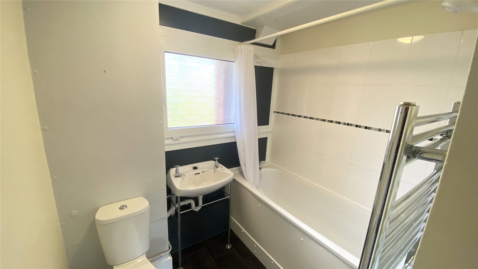 Bathroom suite, with bath, overhead modern thermostatic shower, wash basin, close-coupled w/c and heated towel rail. uPVC double-glazed window with obscured glass, linoleum flooring and light fitting.