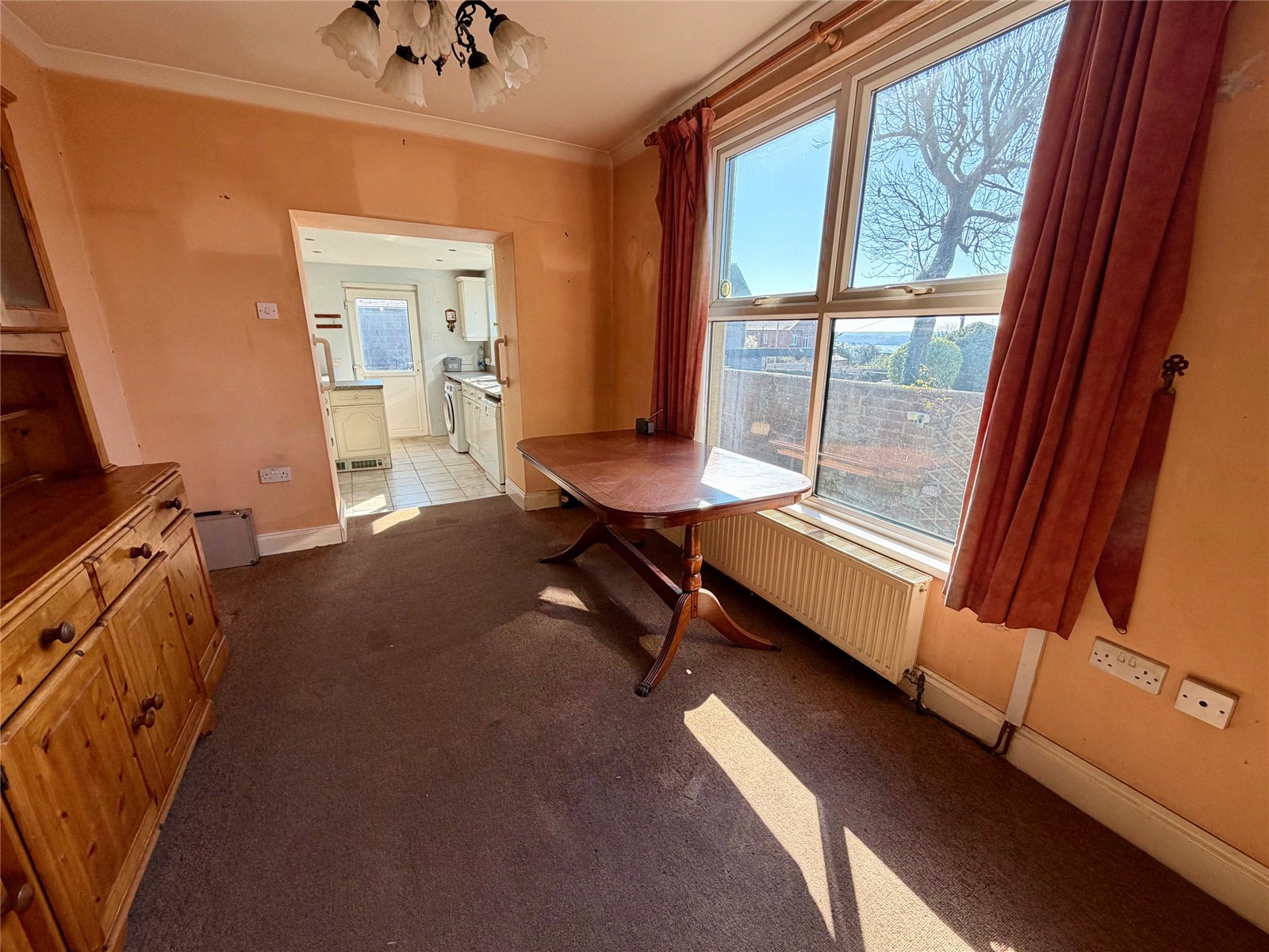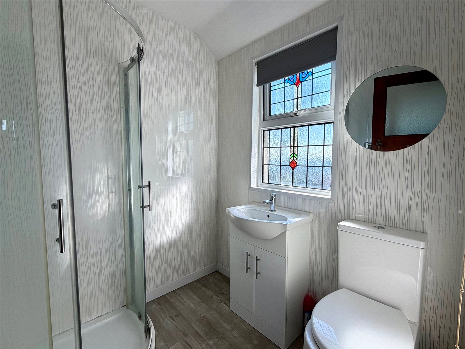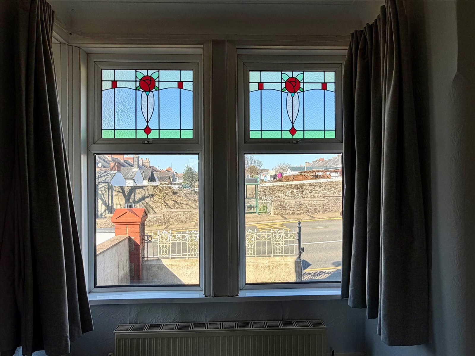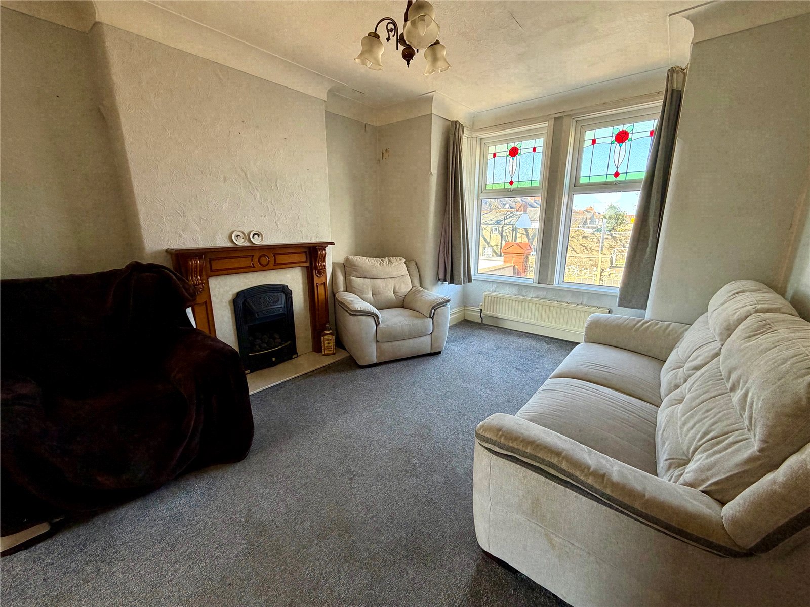 Inside, the accommodation begins with a spacious open-plan lounge and dining area featuring a gas fire and large double-glazed windows. A particularly attractive feature is the original stained glass, which has been thoughtfully incorporated into the double-glazed units, preserving the character of the home. Similar stained glass detailing can also be found in the bathroom window and the main master bedroom, further enhancing the property's period appeal.