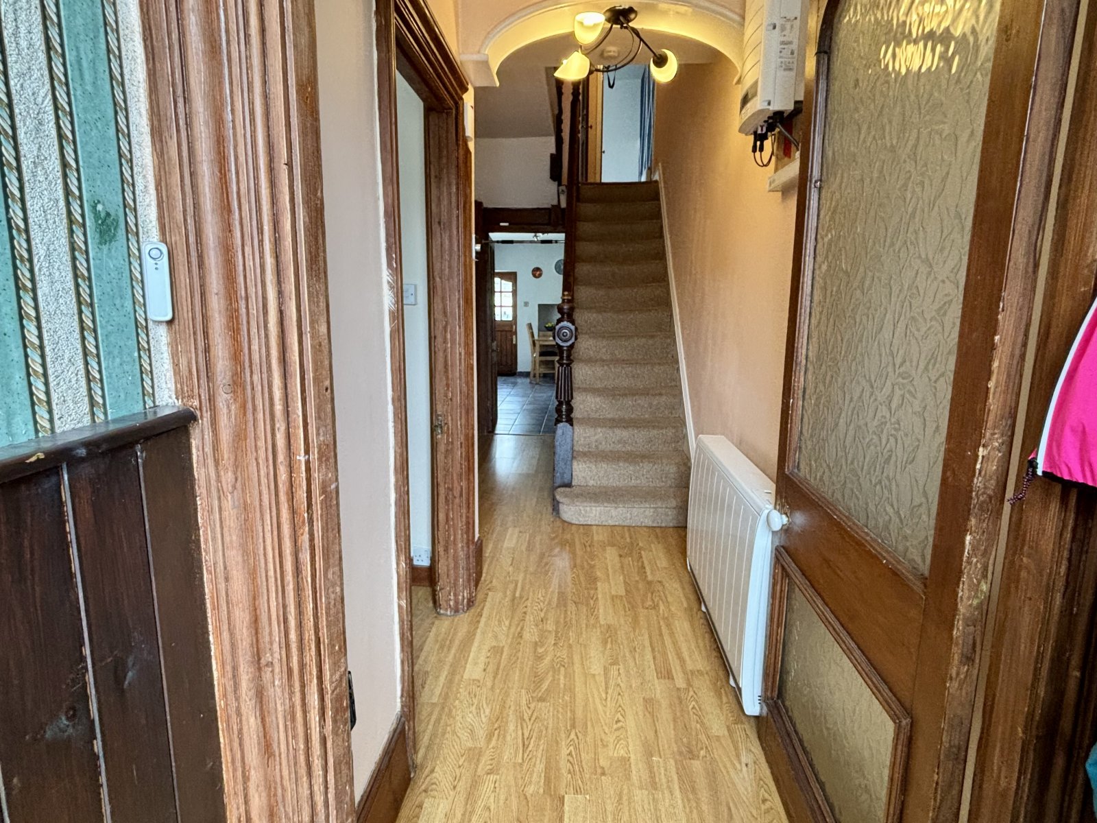 The family kitchen is located at the rear of the property and comes fully equipped with a washer and dryer. It provides direct access to the garden, as well as access from the lounge/dining room, making it ideal for both everyday living and entertaining. A gas boiler is housed within the kitchen, providing central heating throughout the home. The layout includes four well-proportioned bedrooms, with the master bedroom offering large alcoves that provide extra storage options. One bedroom and the family bathroom is conveniently located on the lower-level landing, to the rear of the property, and features a bath with an overhead shower, W.C., and wash hand basin. There is also additional space for storage in the bathroom.