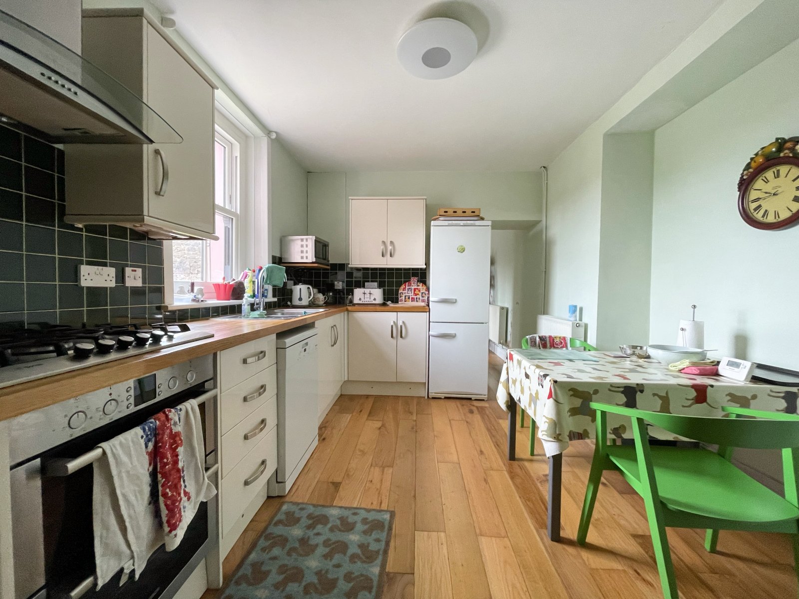Wooden flooring, range of base and eye level units, sink and drainer, tile splashback, gas hob, electric oven, space for dishwasher and fridge freezer, double glazed uPVC window to side, radiator.