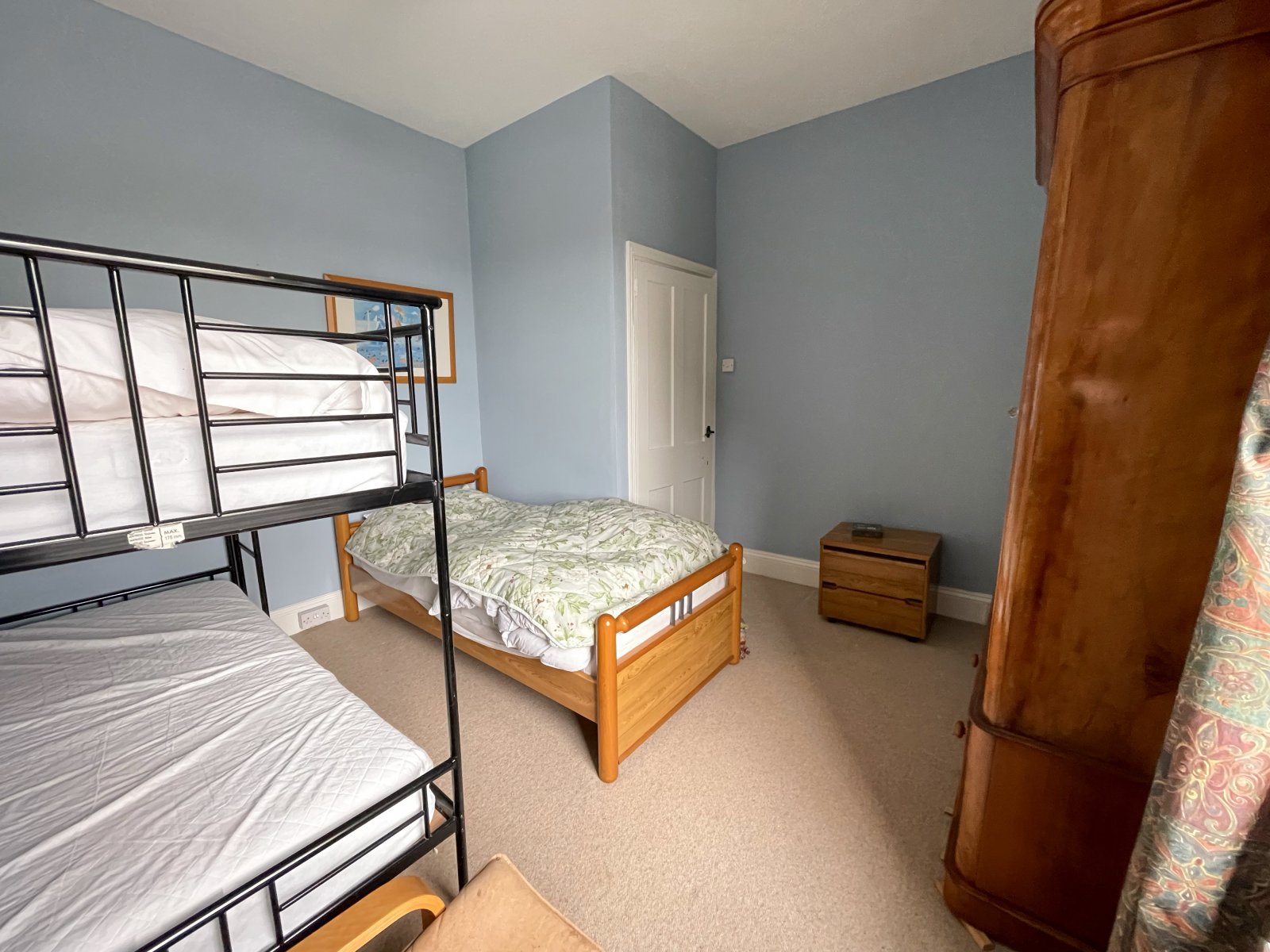 Carpet flooring, storage cupboard, radiator.