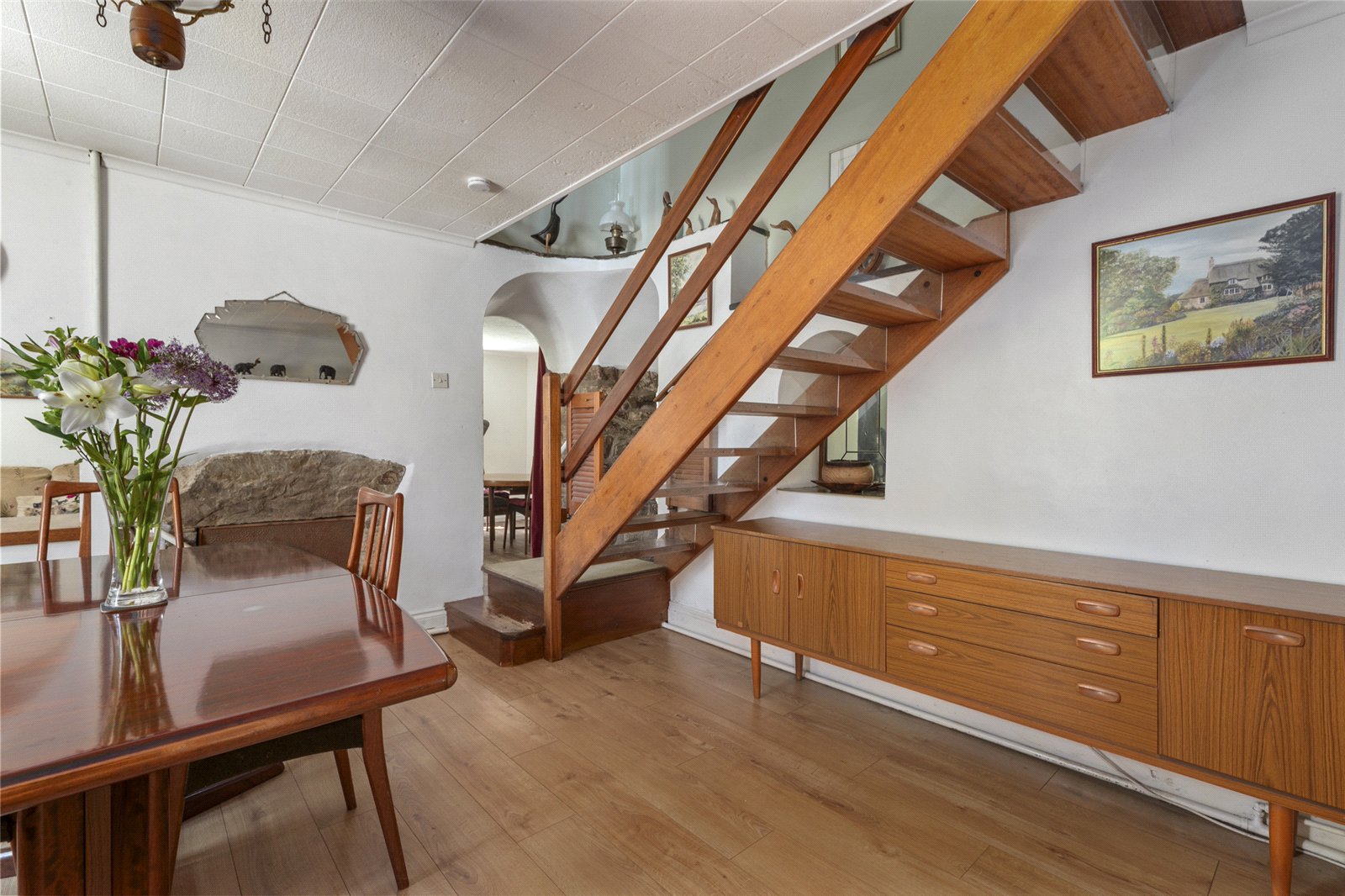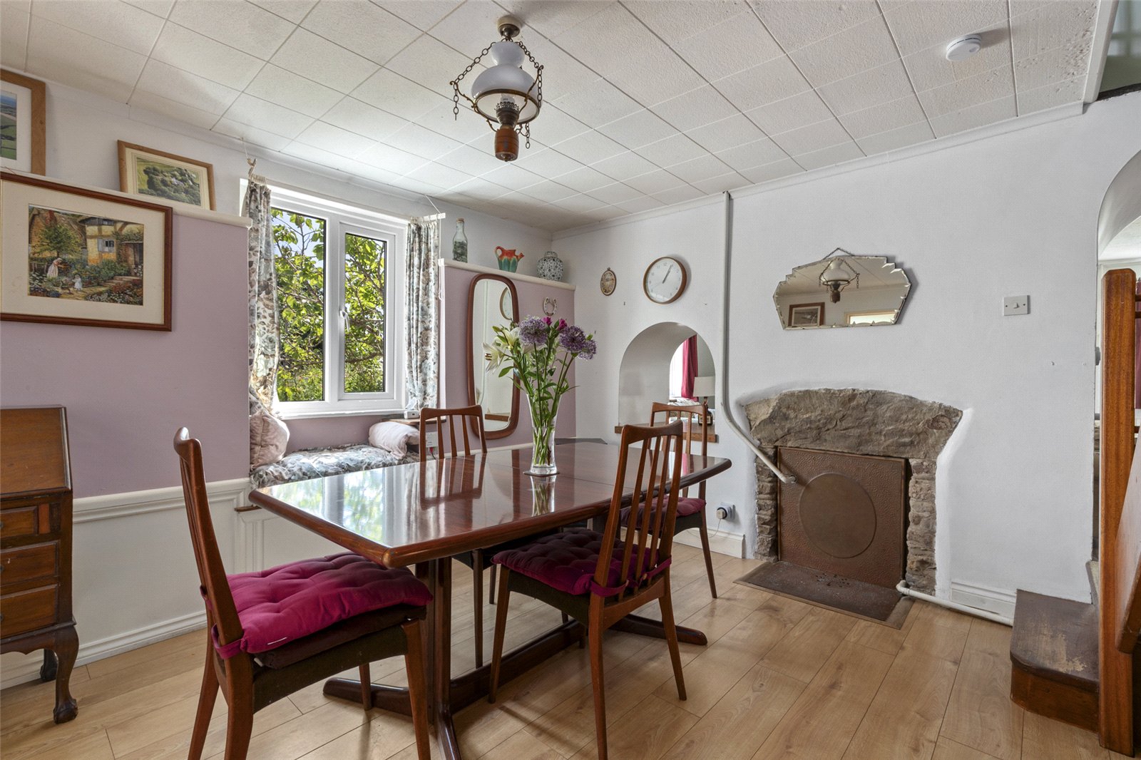 Originally constructed as a traditional period dwelling, the property was sympathetically extended and renovated in the 1970s to create a spacious and flexible layout, now comprising four well-appointed bedrooms and three generous reception rooms. This expansion has resulted in a highly functional home with ample space for family living, entertaining, or working from home. Each room offers its own unique charm, with large windows that frame views of the surrounding gardens and flood the interior with natural light.