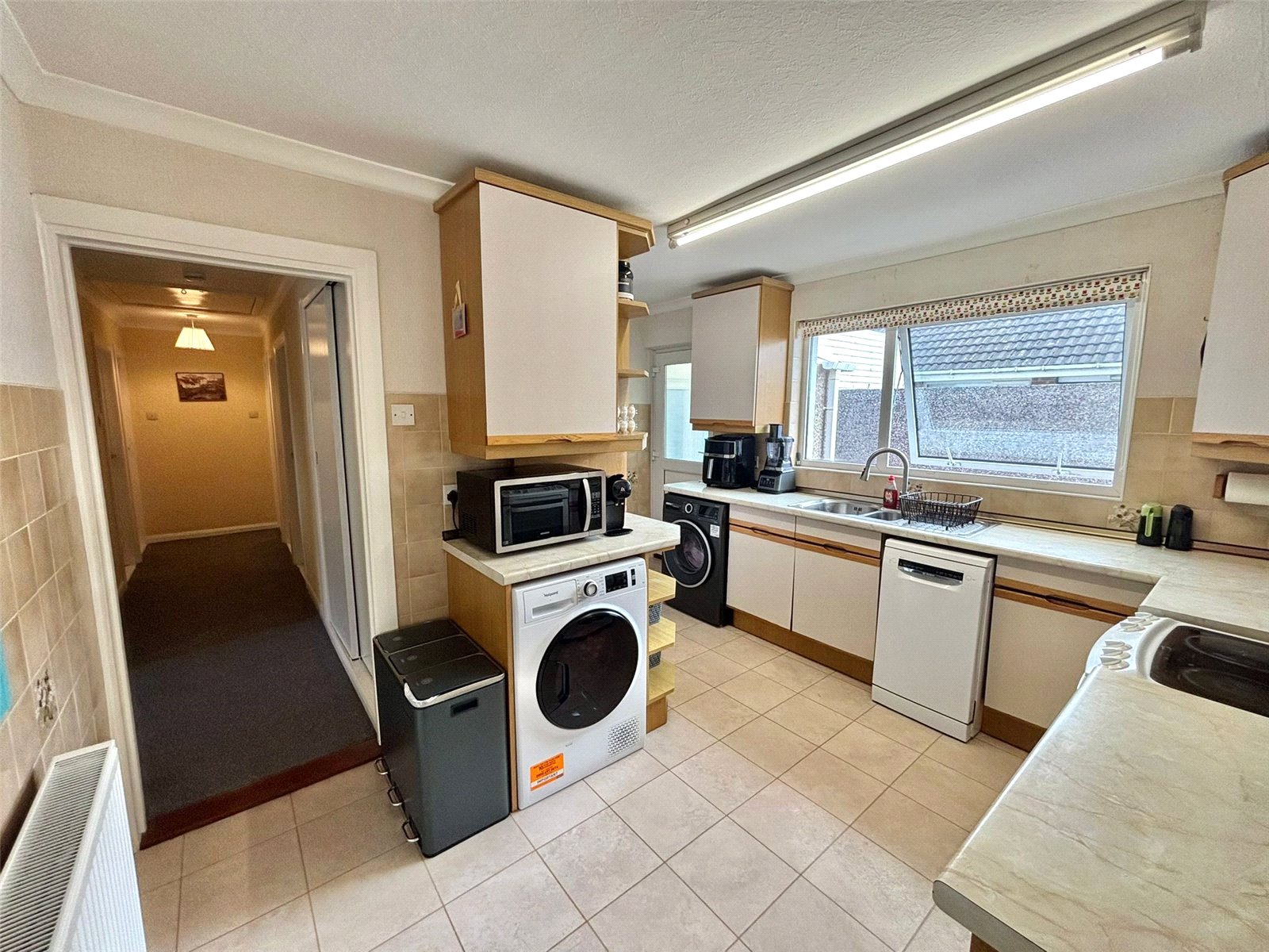 A well-proportioned, bright kitchen space offering excellent storage via corner shelving and wall units. With a clean, neutral finish and convenient access to the hallway, this room is ready for immediate use.
