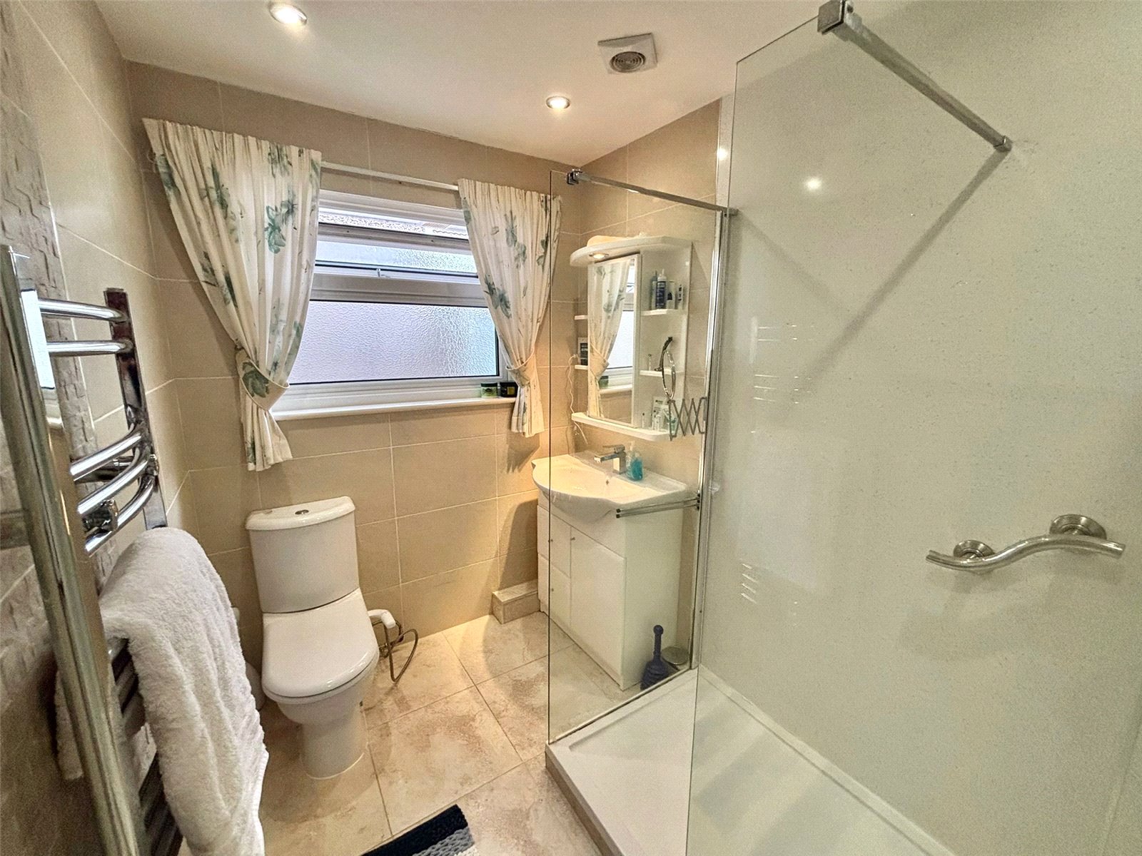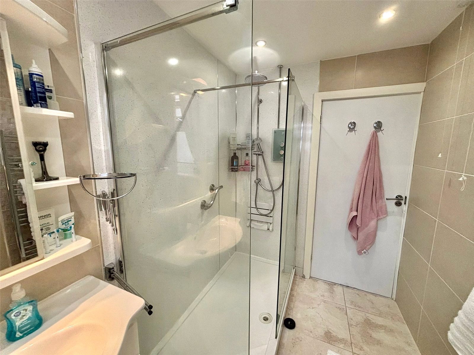 Stylish and immaculate shower room benefiting from neutral tiling, recessed spotlights, and a window for natural ventilation. This clean, modern space is ready to use.