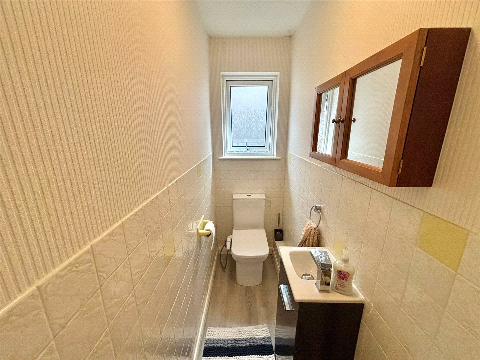 Convenient ground floor Water Closet featuring half-height tiling and neutral decor. Includes a modern close-coupled WC, a small vanity washbasin unit, and a window for ventilation.