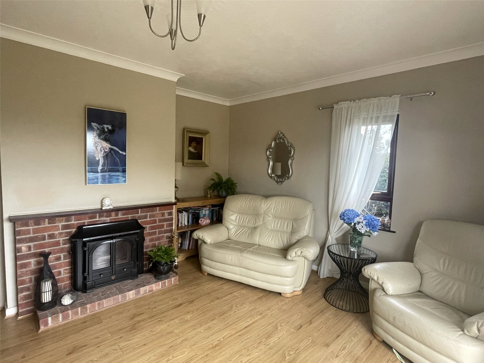 Laminate floor, uPVC double glazed sliding doors to front, 2 x uPVC double glazed window, multi fuel burner in feature fire place, electric radiator, ceiling light.