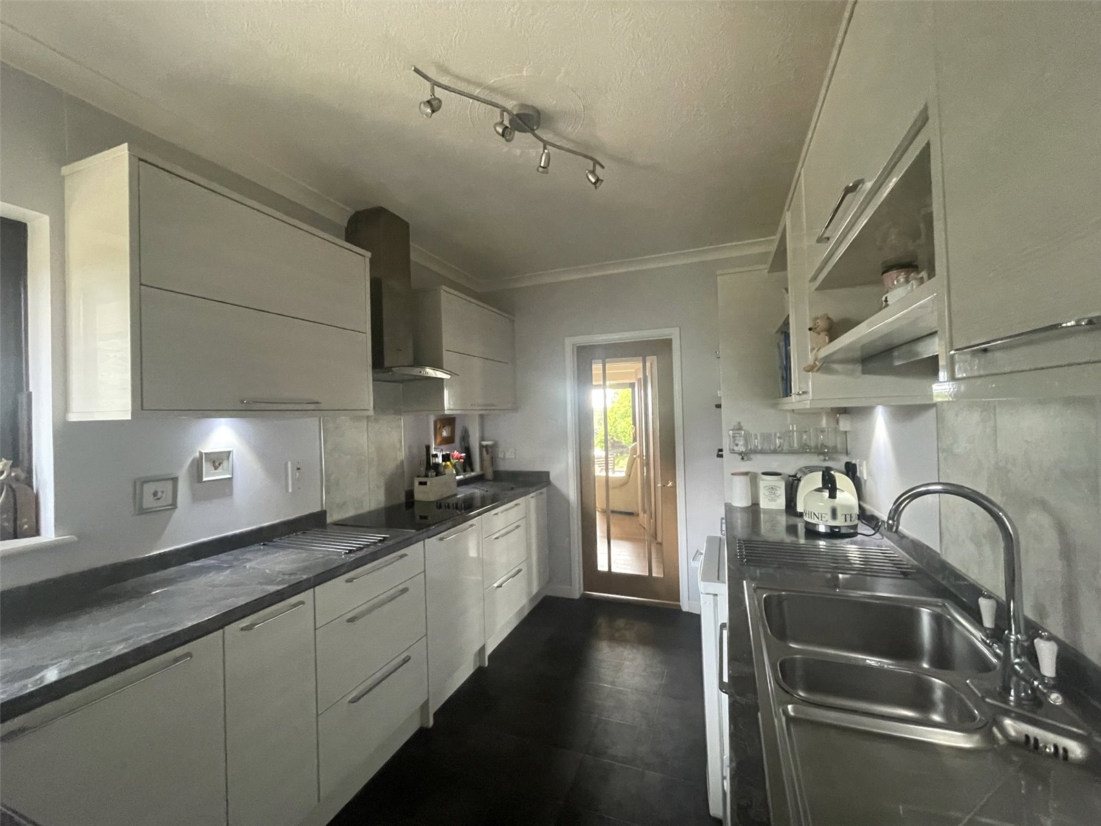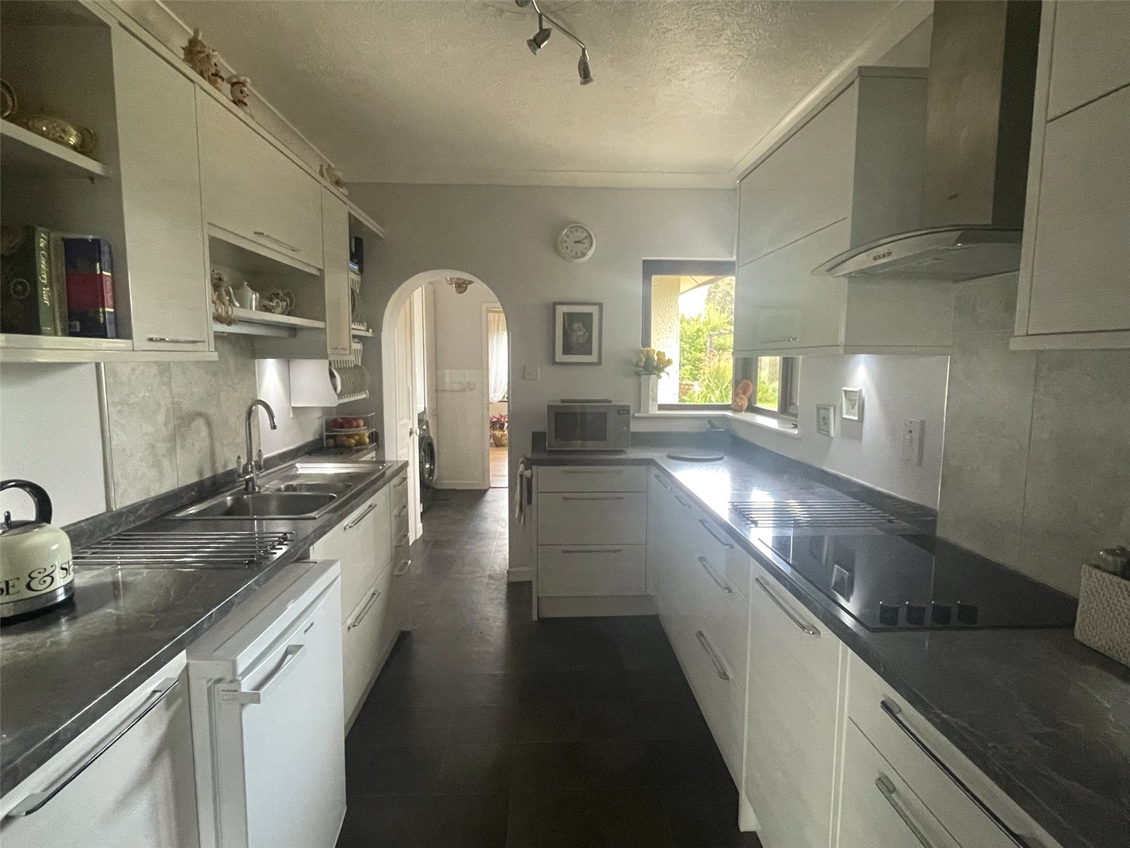 Tiled floor, a range of base and wall units with integrated electric hob and overhead extractor and light, eyelevel double oven, 1.5 sink and drainer with mixer taps, space for fridge, ceiling lights.