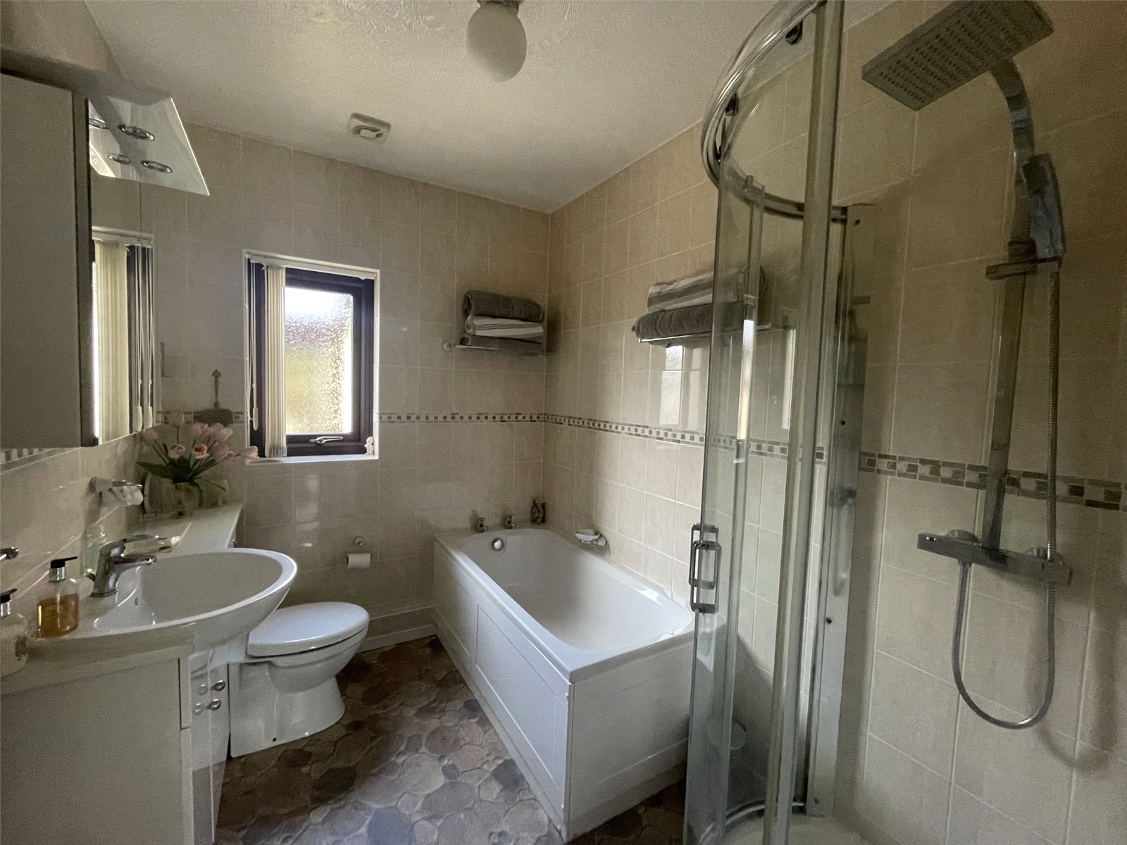 Vinyl floor, corner shower with curved sliding door, fitted bath with taps, WC and wash hand basin in fitted vanity unit with wall mounted mirrored cabinet and lights above, electric heated towel rail, uPVC double glazed window with obscure glass, ceiling light.