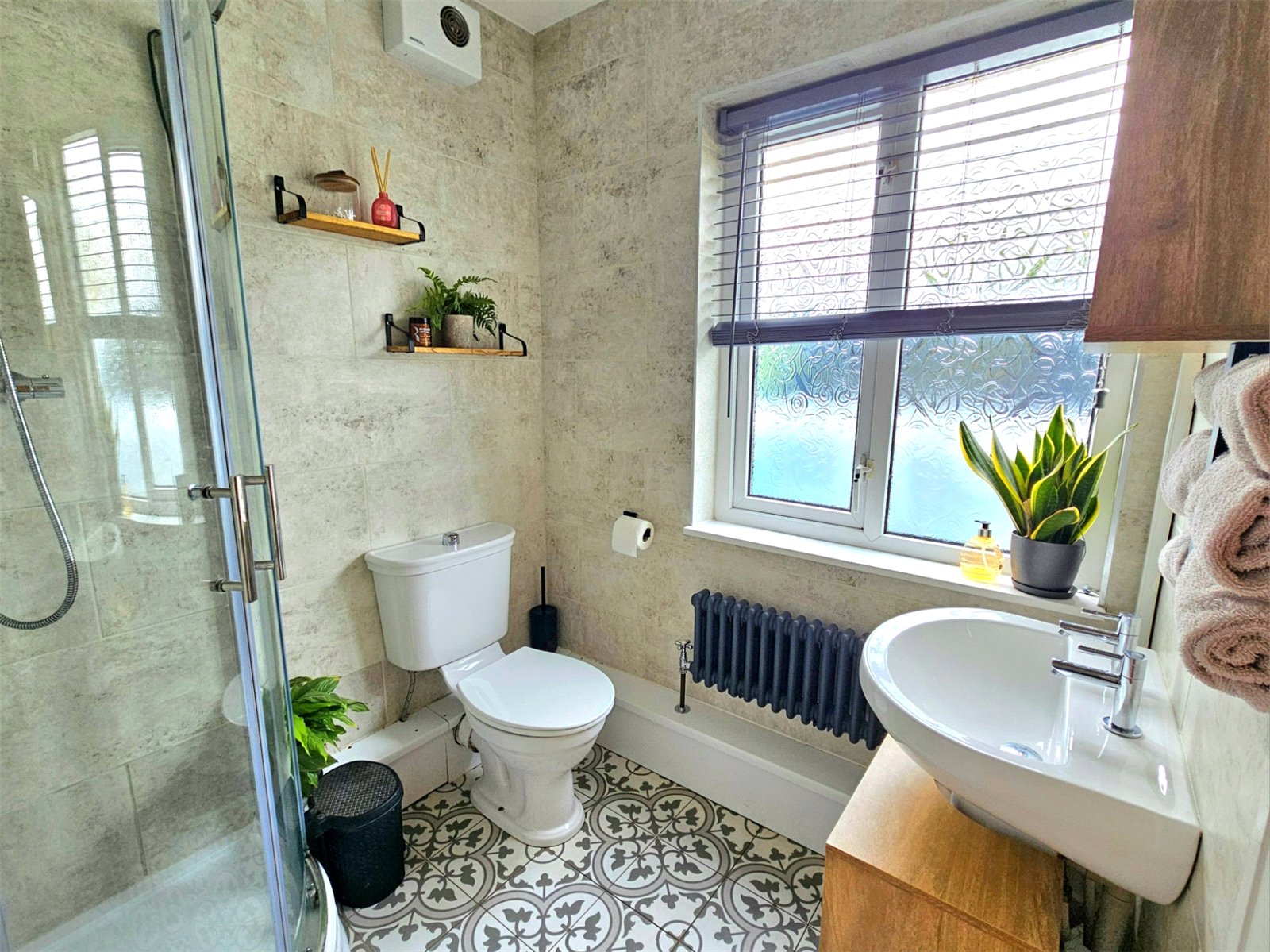 A contemporary and stylish shower room with a walk-in shower cubicle, featuring a glass screen and a rainfall shower head. The walls are finished with large, modern grey tiles, complemented by a decorative patterned tiled floor.