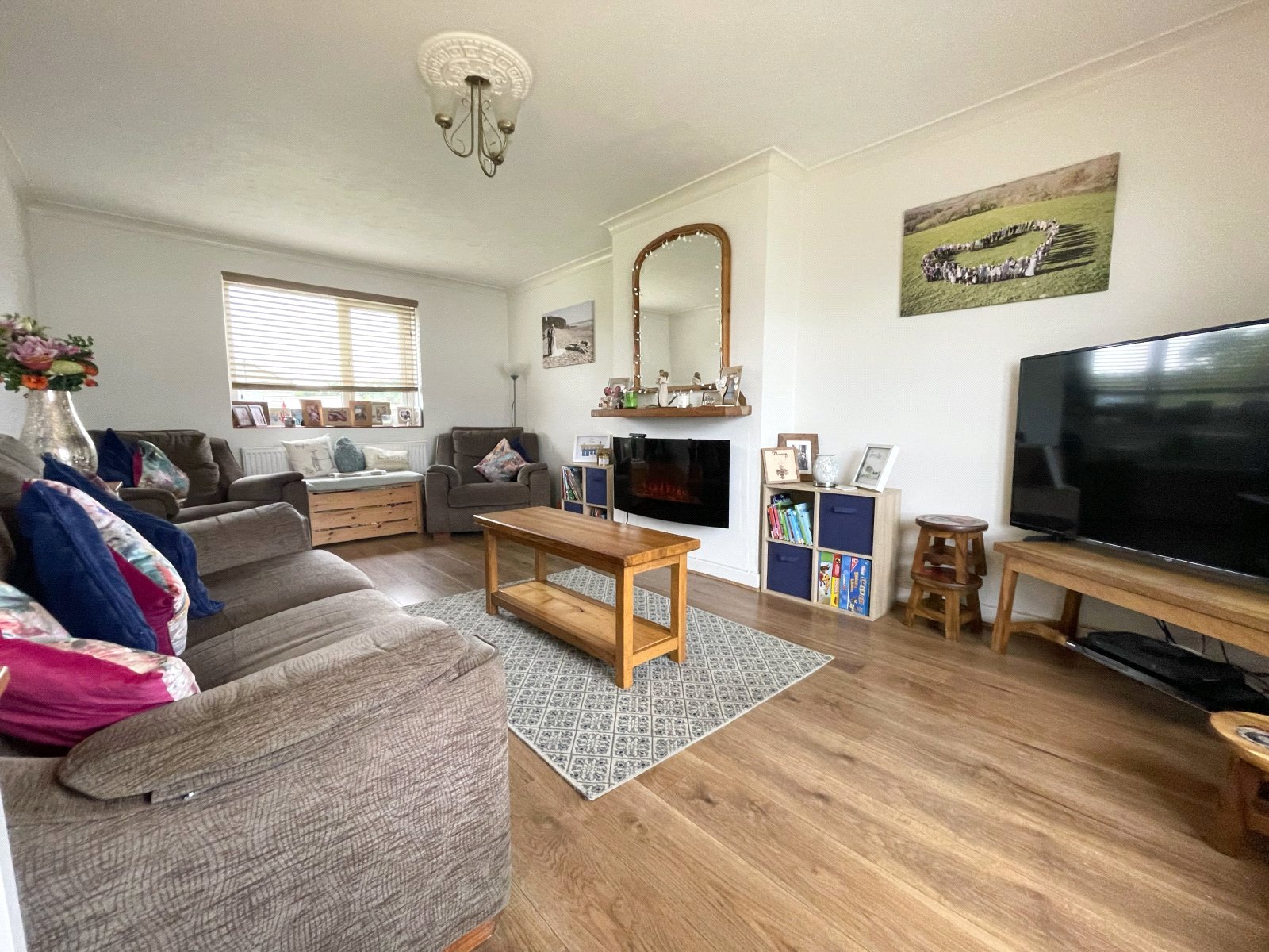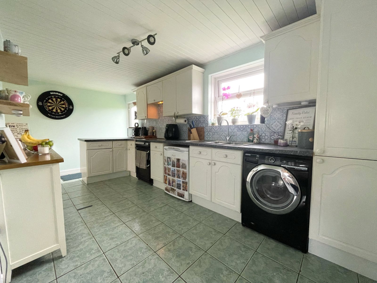 Tiled flooring, tile splashback, range of base and eye level units, sink and drainer, space for cooker and white goods, pantry cupboard, under stairs storage, radiator, 3x double glazed uPVC windows, 2x double glazed uPVC doors.