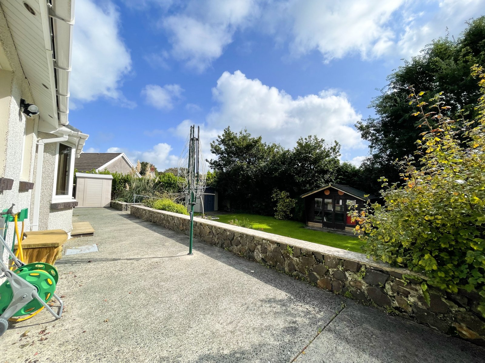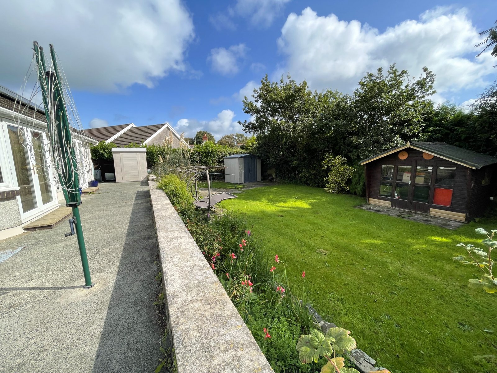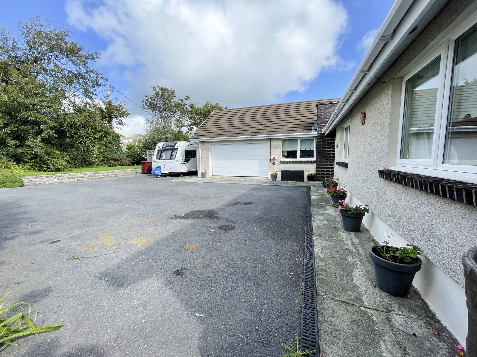 Electric up and over door, loft access, space for white goods, wash hand basin, work bench, boiler, obscure glass double glazed uPVC window to fore.