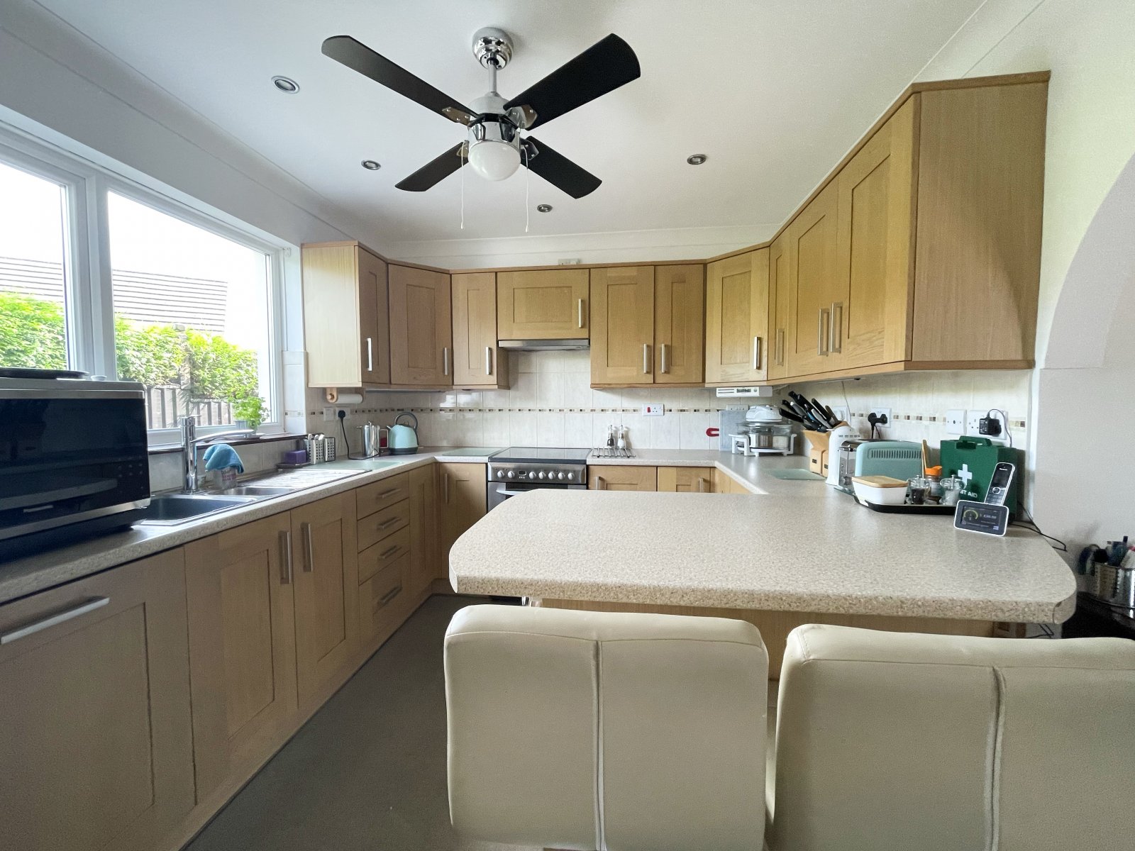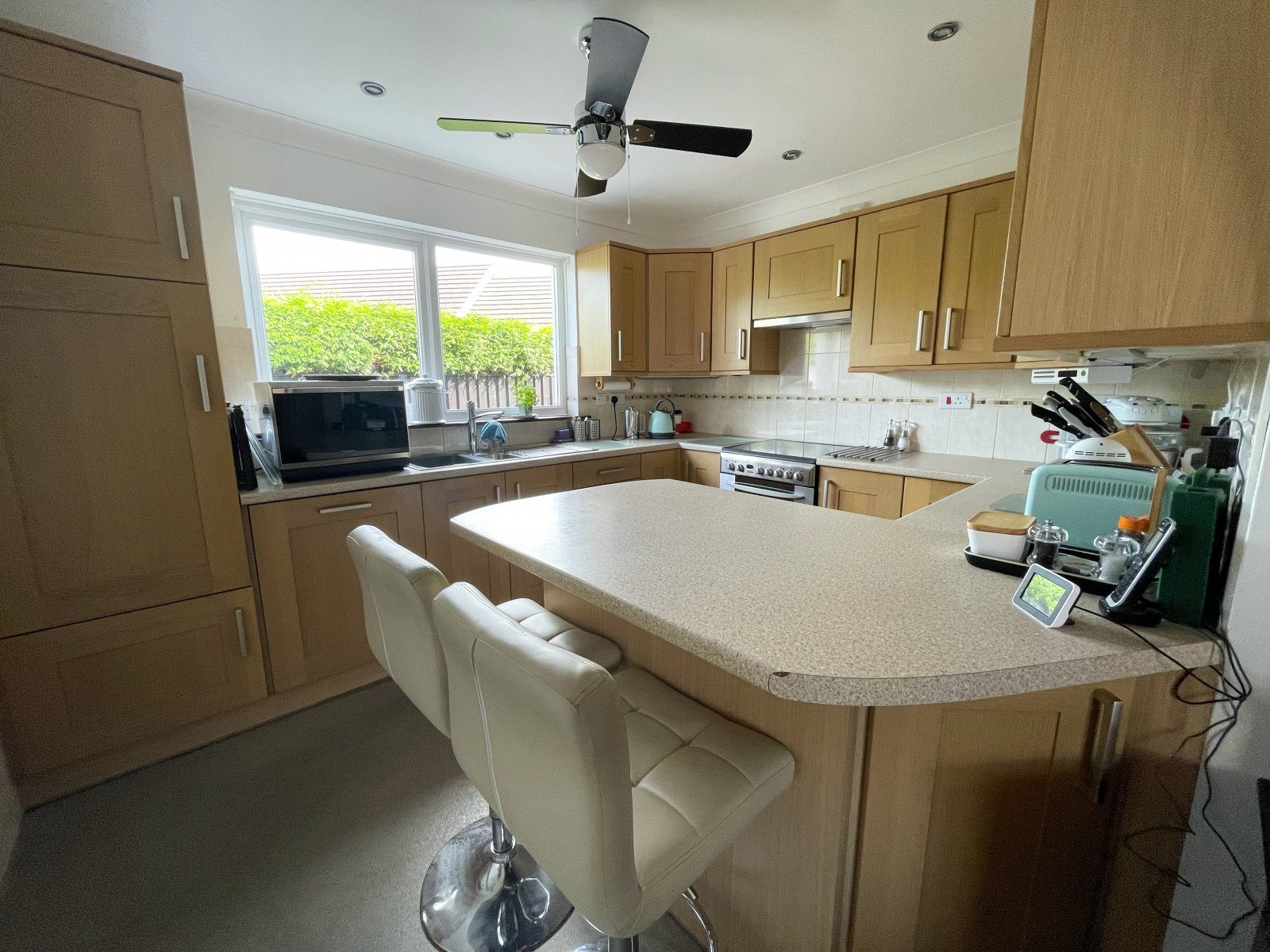 Lino flooring, range of base and eye level units, sink and drainer, tile splashback, space for cooker, integrated fridge and dishwasher, breakfast bar, radiator, heated towel rail, double glazed uPVC window to side.