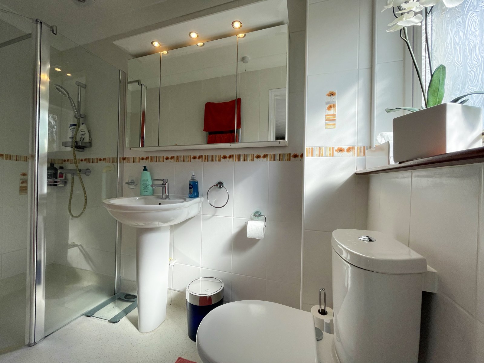 Lino flooring, tiled walls, wash hand basin, WC, heated towel rail.