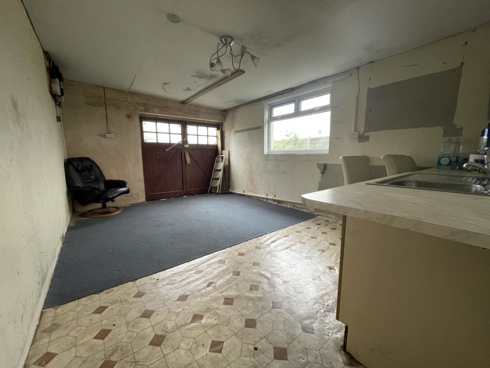 Base units, space for white goods, sink and drainer, double glazed uPVC window to side, double timber doors to fore.