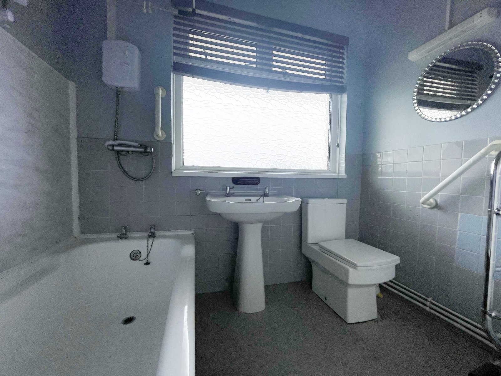 Laminate flooring, bath with shower over, wash hand basin, WC, heated towel rail, double glazed obscure uPVC window to fore.