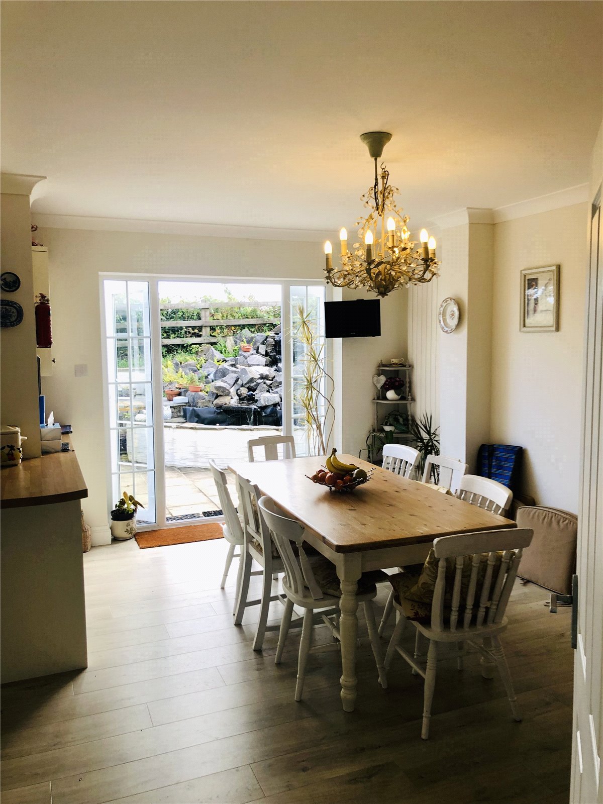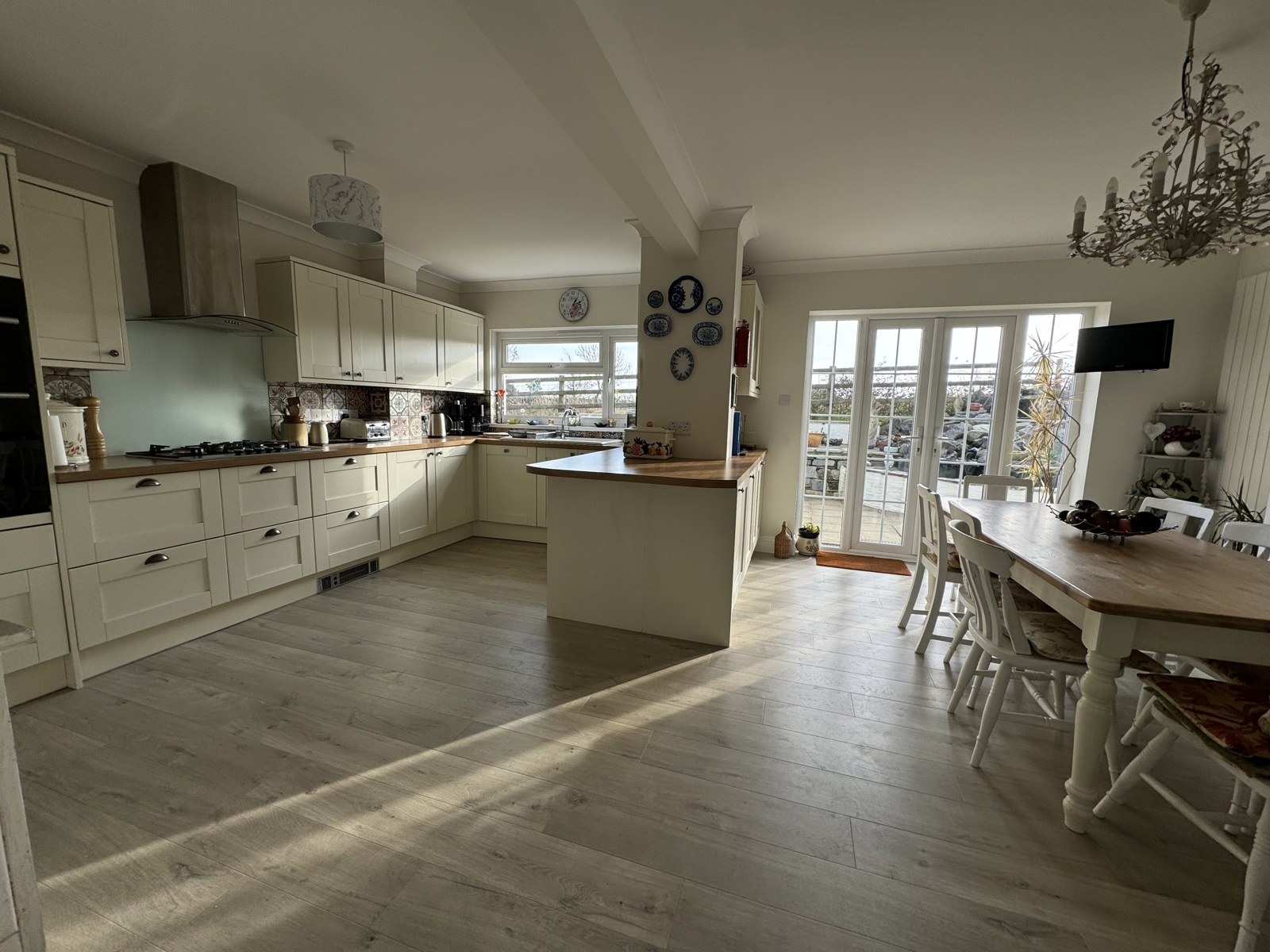 LVT flooring, range of base and eye level units, integrated oven, hob, dishwasher and fridge freezer, sink and drainer, tile splashback, 2x radiator, double glazed uPVC window and patio doors.
