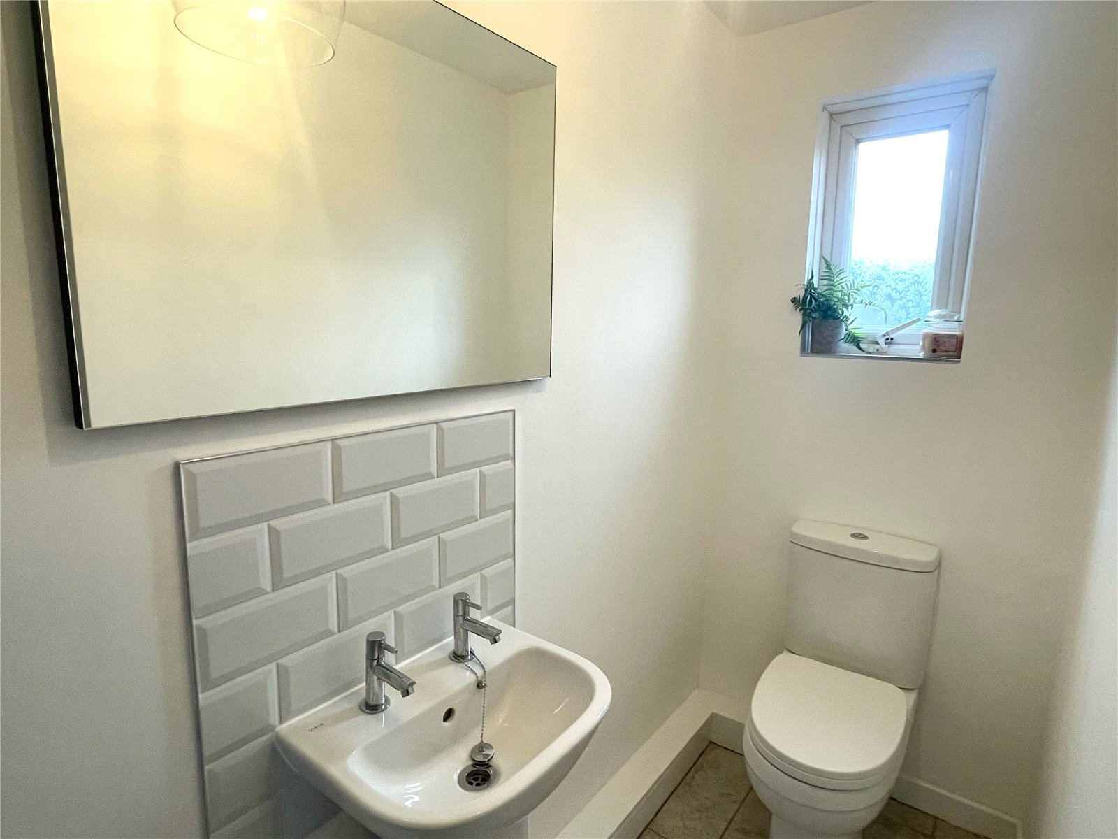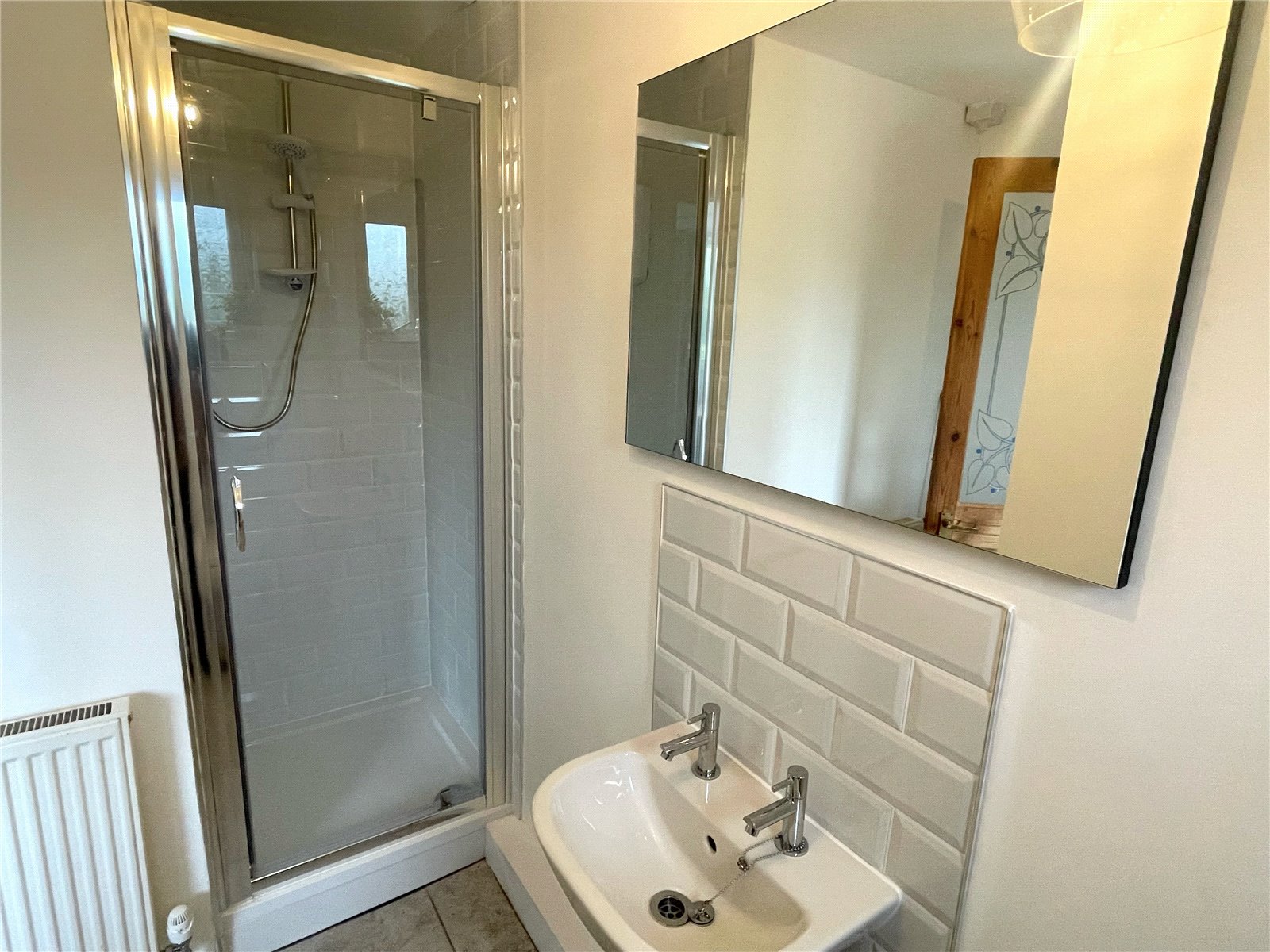 Tiled floor, wash hand basin with taps and tiled splashback, shower with tile surround and glass door, radiator, ceiling light, uPVC double glazed window with obscure glass.