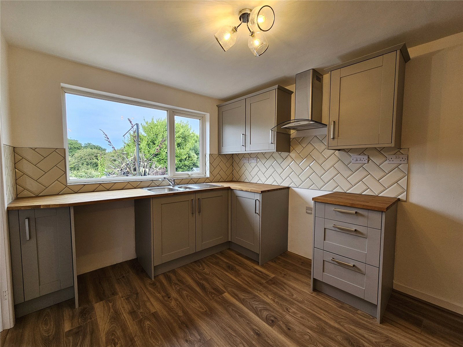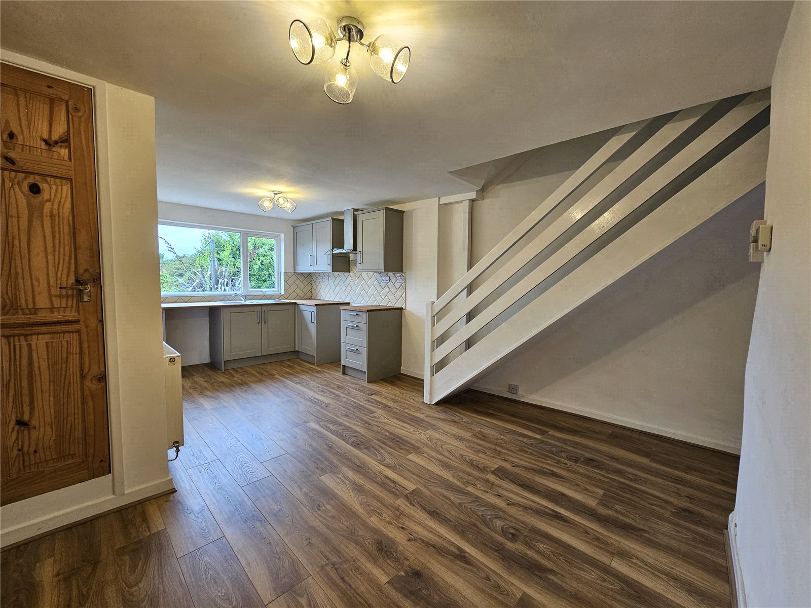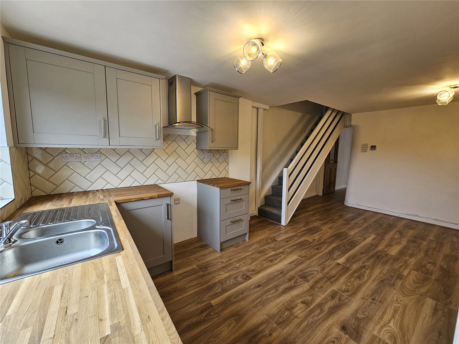 Laminate floor continues, storage cupboard with boiler, stairs to 1st floor, radiator, 2 ceiling lights, a range of base and wall units with space for cooker and washing machine, 1.5 sink and drainer with mixer tap, tiled backsplash, overhead extractor and light, uPVC double glazed window to rear.