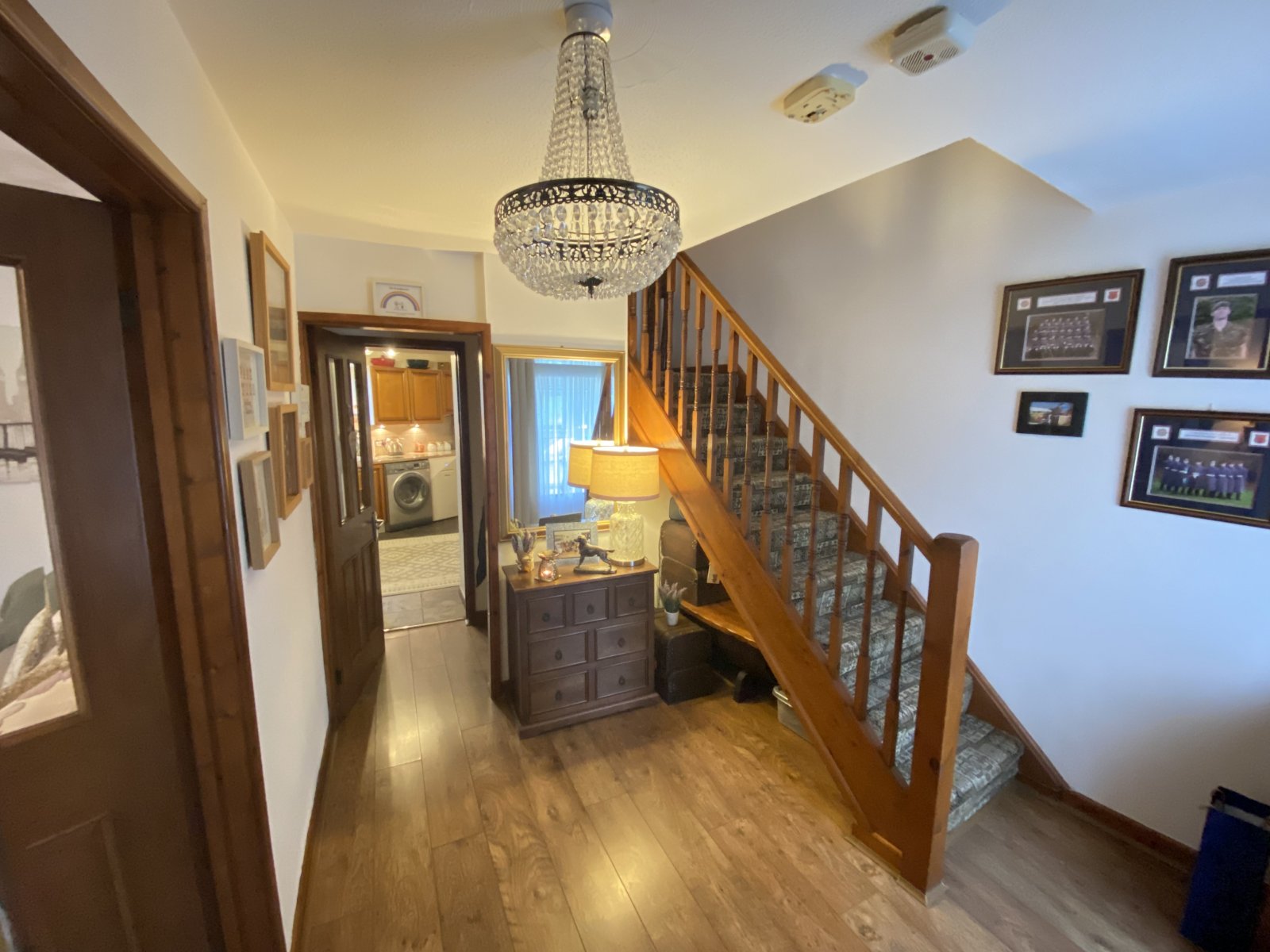 Front door leading to spacious hallway, light fitting, laminate flooring