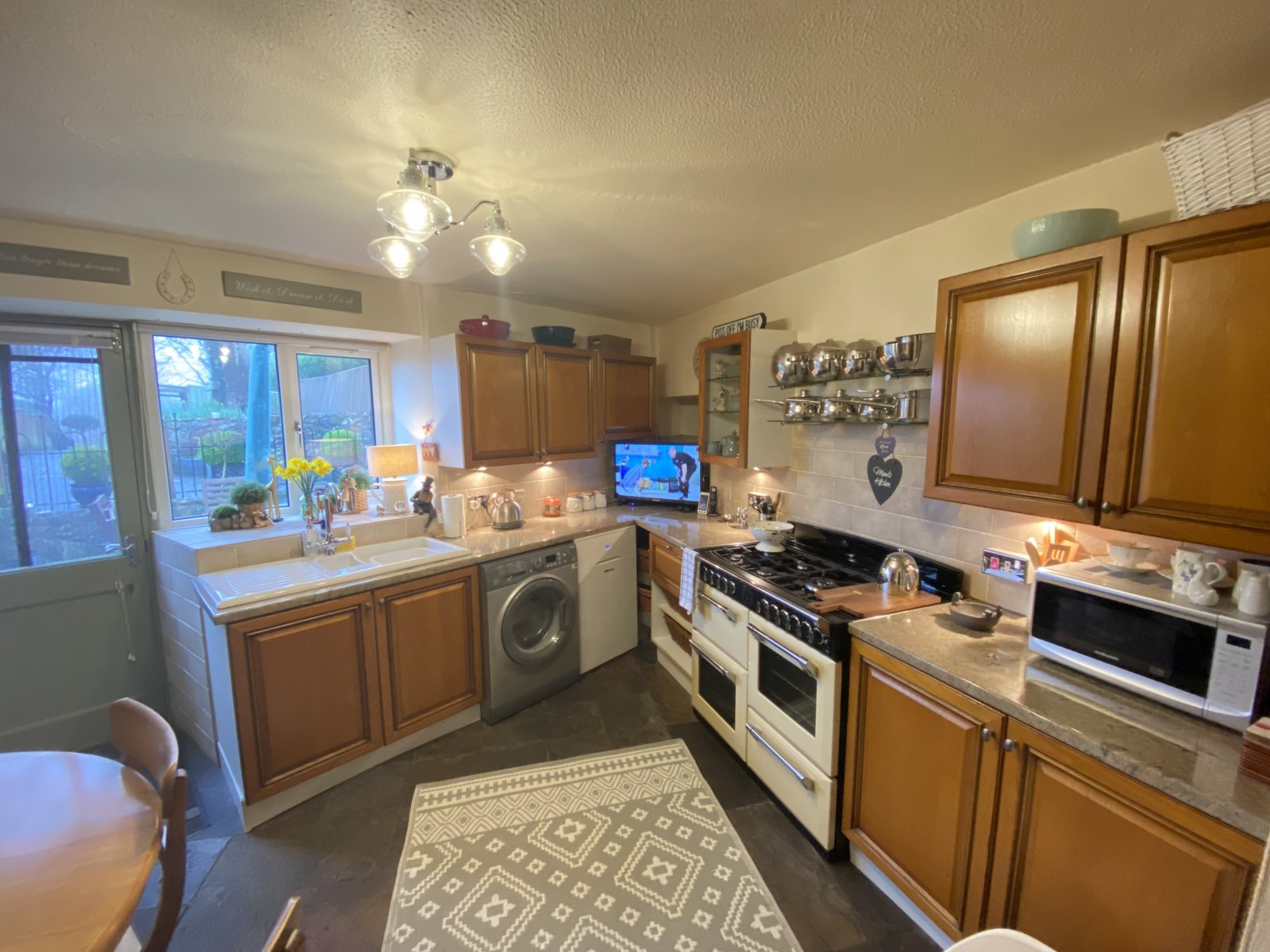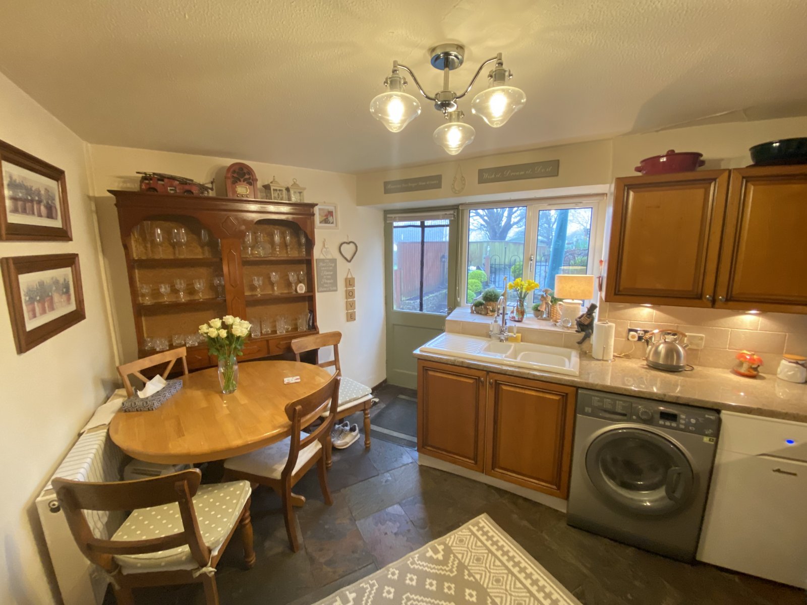 Fitted kitchen/diner with door leading torear garden, D Glazed window, tiled floor.