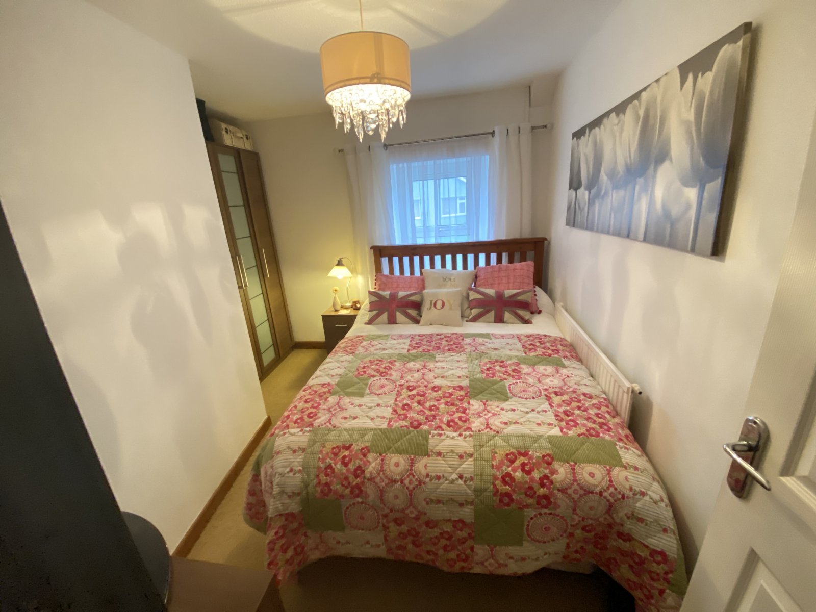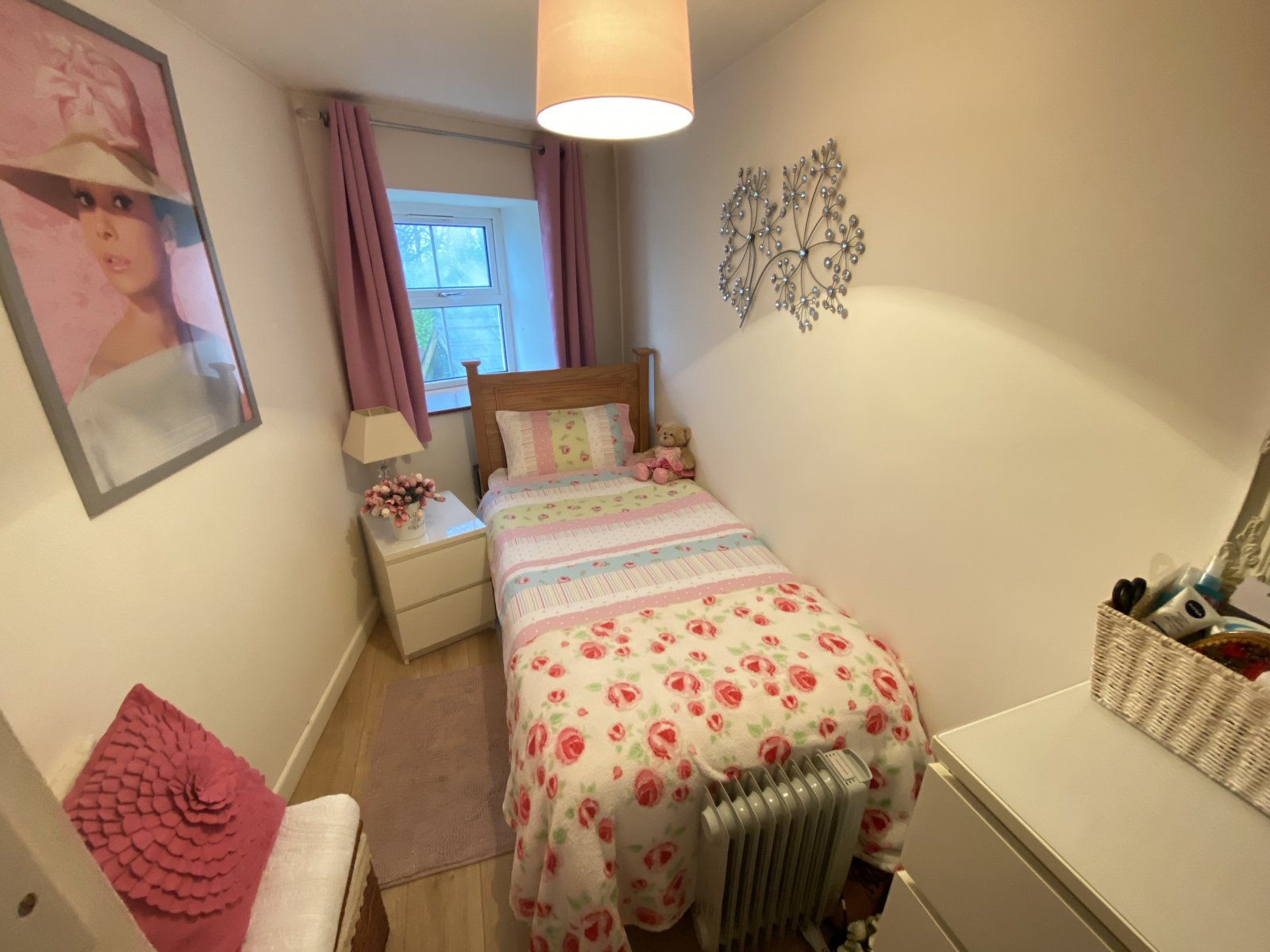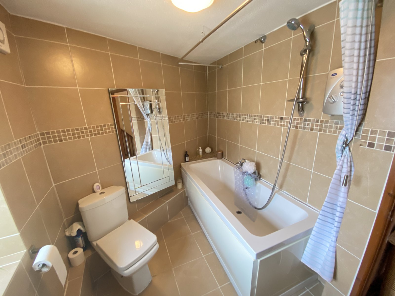 Fully tiled floor & walls, fitted white bathroom suite with shower over bath.