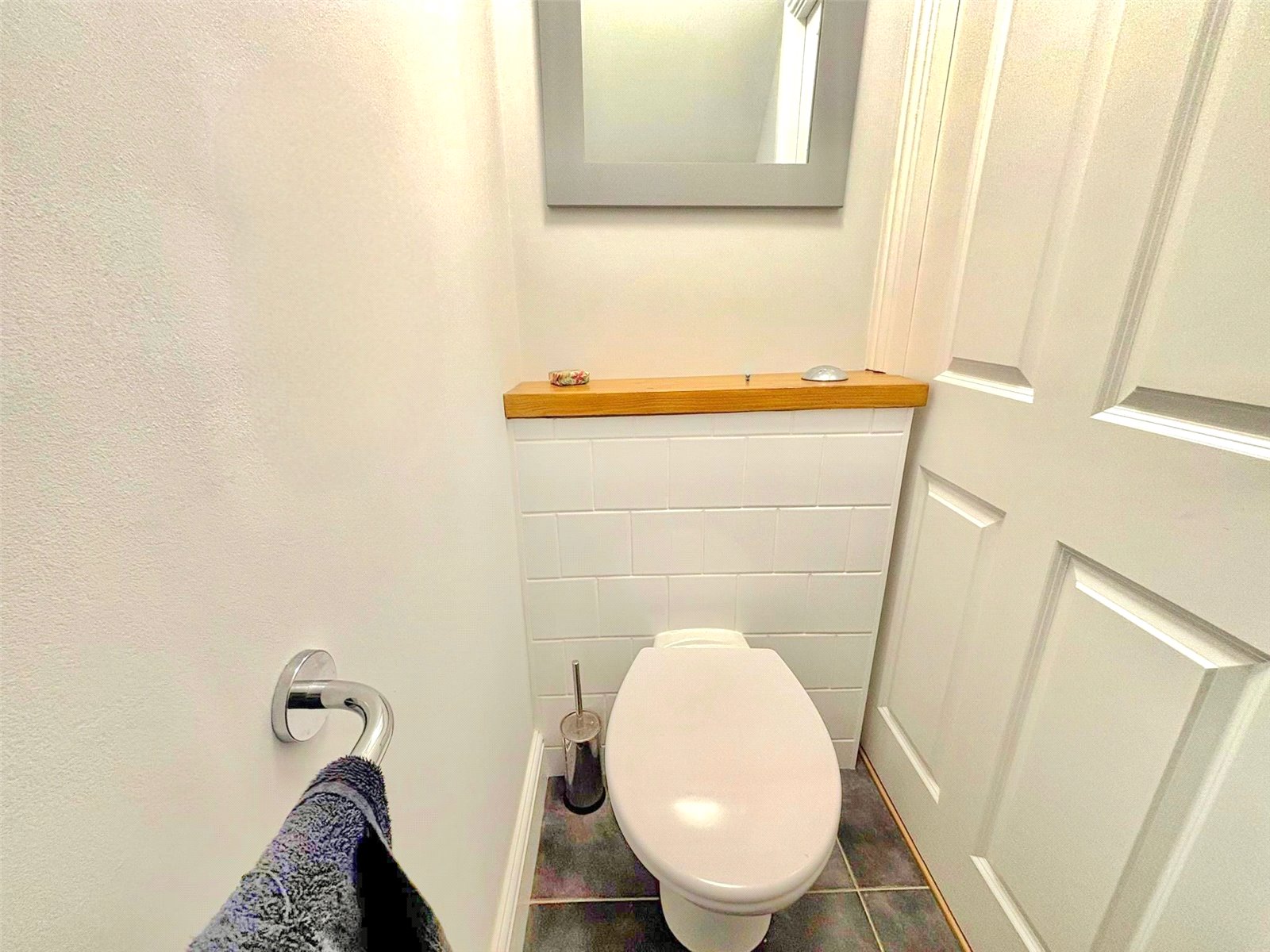 This convenient ground floor WC offers a practical and stylish solution. It features a modern basin set into a vanity unit with storage, complemented by a sleek dark countertop. The WC is neatly integrated with a concealed cistern, topped by a timber shelf ideal for displaying essentials. With crisp white walls, dark tiled flooring, and a chrome towel rail, this compact bathroom is both functional and aesthetically pleasing.