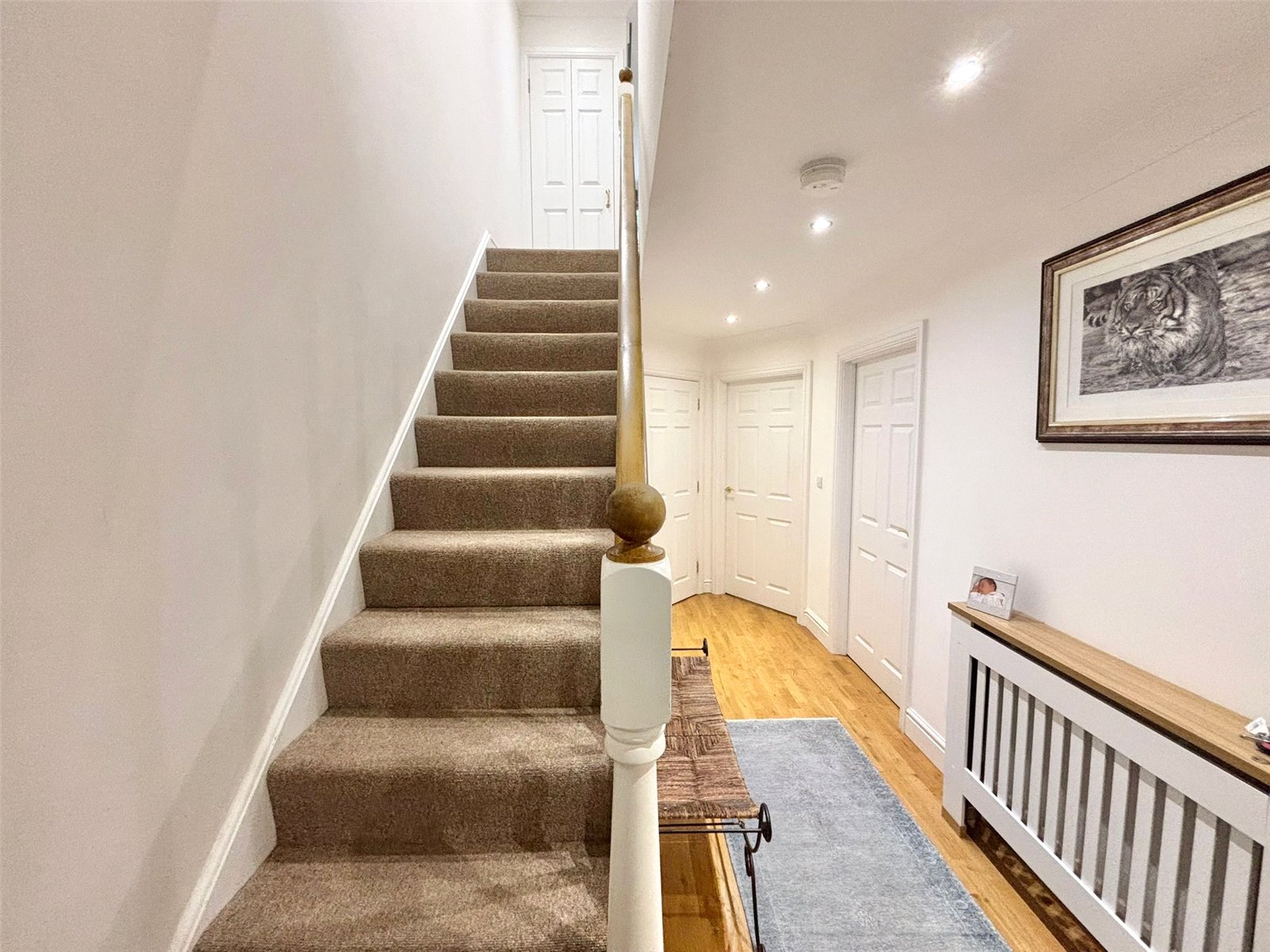 This well-proportioned ground floor bedroom offers a bright and versatile space, ideal as a guest room or a comfortable personal sanctuary. Featuring direct access to the front driveway through large French doors, it benefits from ample natural light and convenient entry. The room is neutrally decorated with light-colored walls and soft carpeting, providing a blank canvas for personal touches. A radiator ensures warmth, making this an inviting space throughout the year.