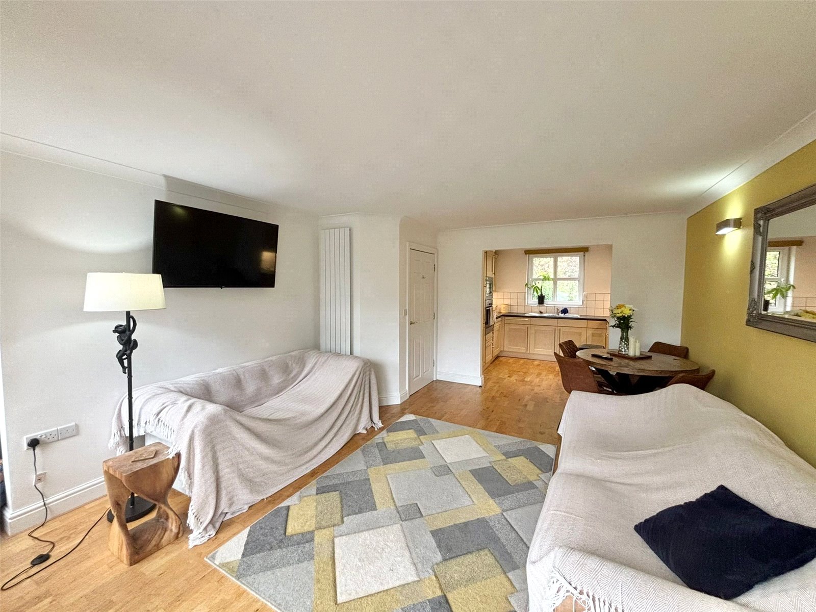 This versatile open-plan living area seamlessly combines comfort, dining, and a dedicated workspace, with easy access to the adjacent kitchen. Bathed in natural light from large windows and French doors opening onto a Juliet balcony, the room features warm wooden flooring throughout.