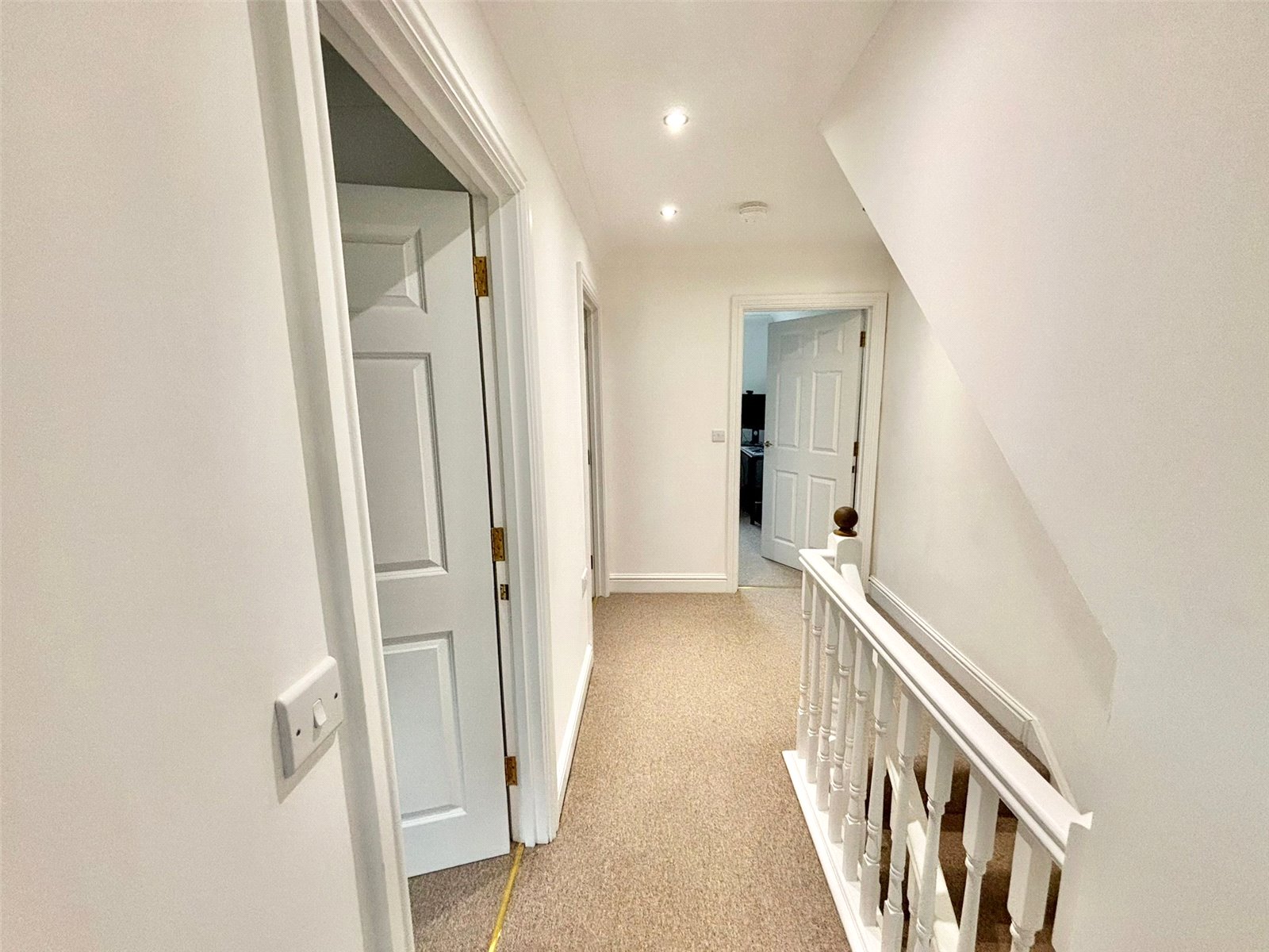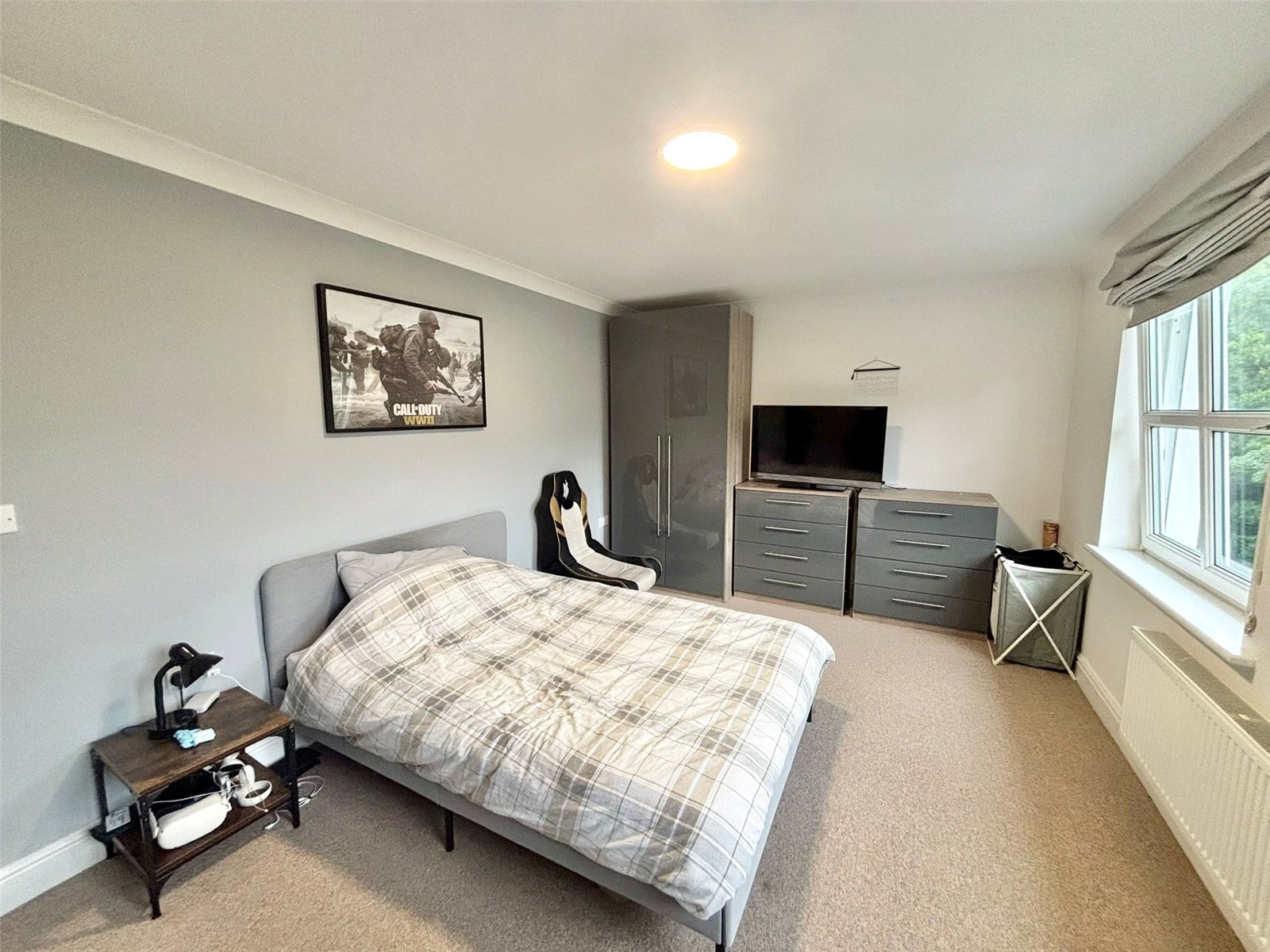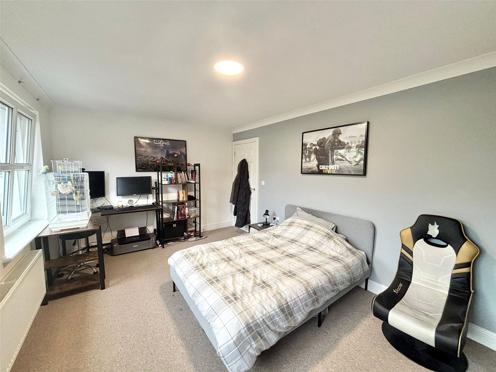 This spacious second-floor bedroom offers a comfortable and private retreat, enjoying views over the rear garden from its large windows. The room benefits from a neutral color palette, featuring a calming grey accent wall and light-colored carpeting, providing a versatile backdrop for any decor. Ample space allows for a double bed, generous freestanding wardrobes, and a dedicated desk area, making it ideal for both relaxation and study.
