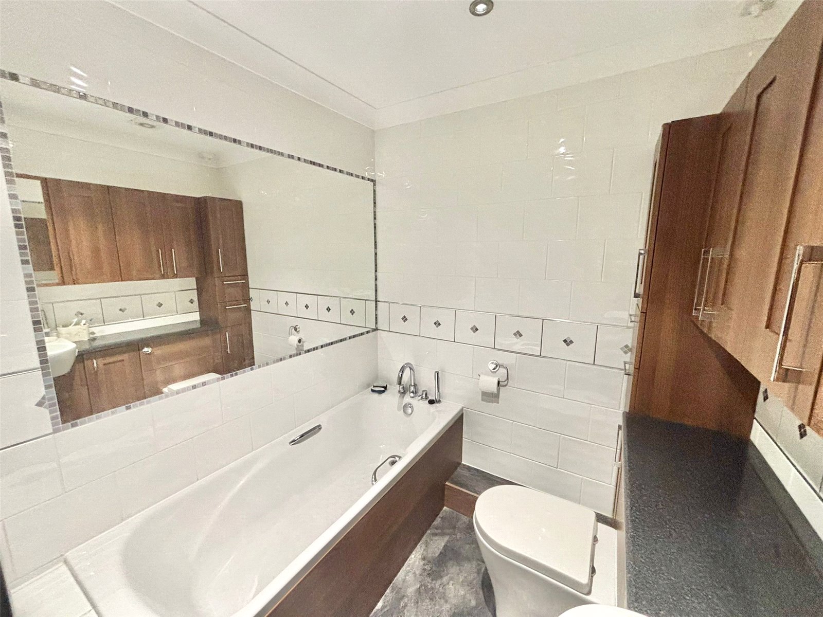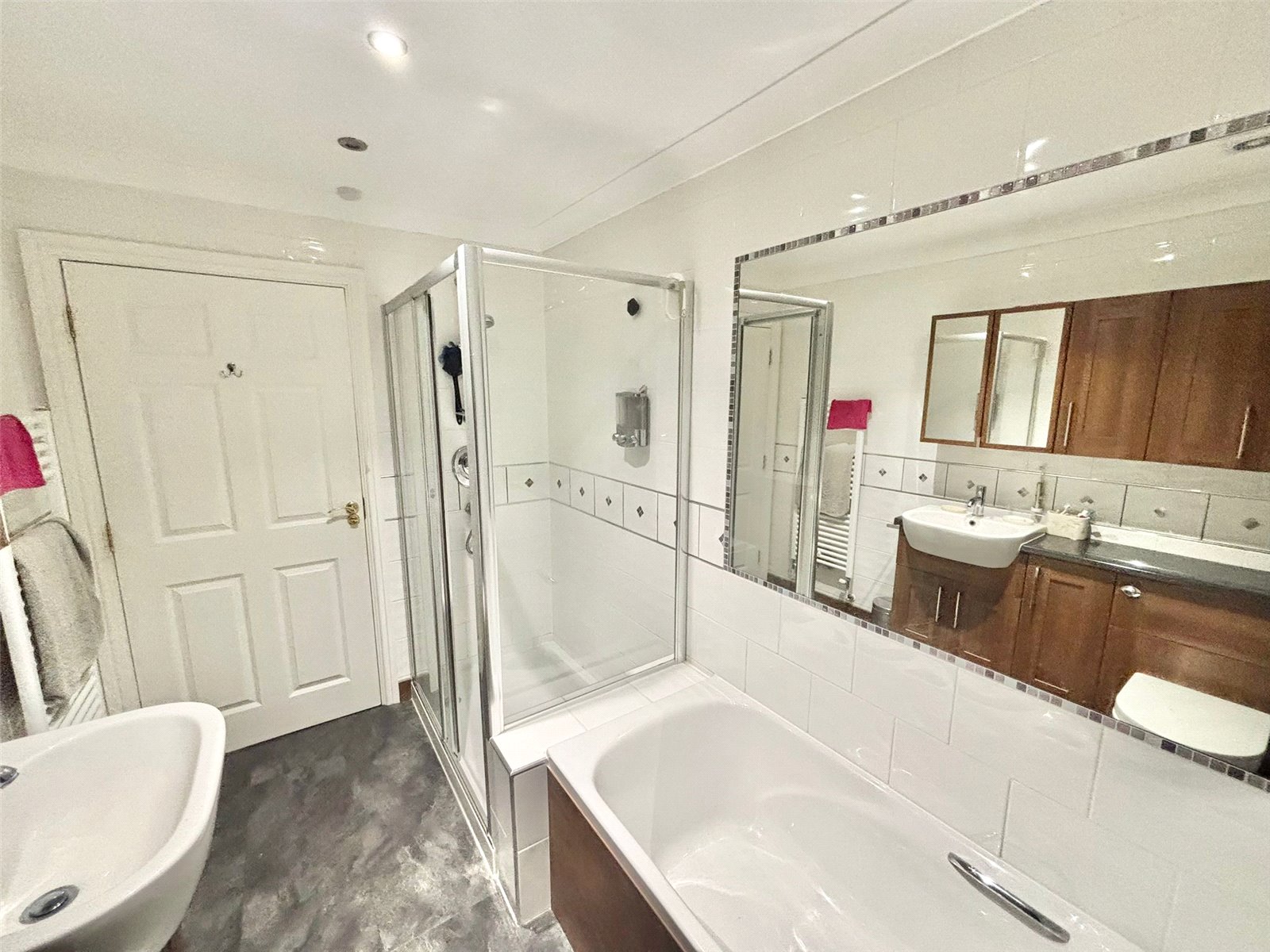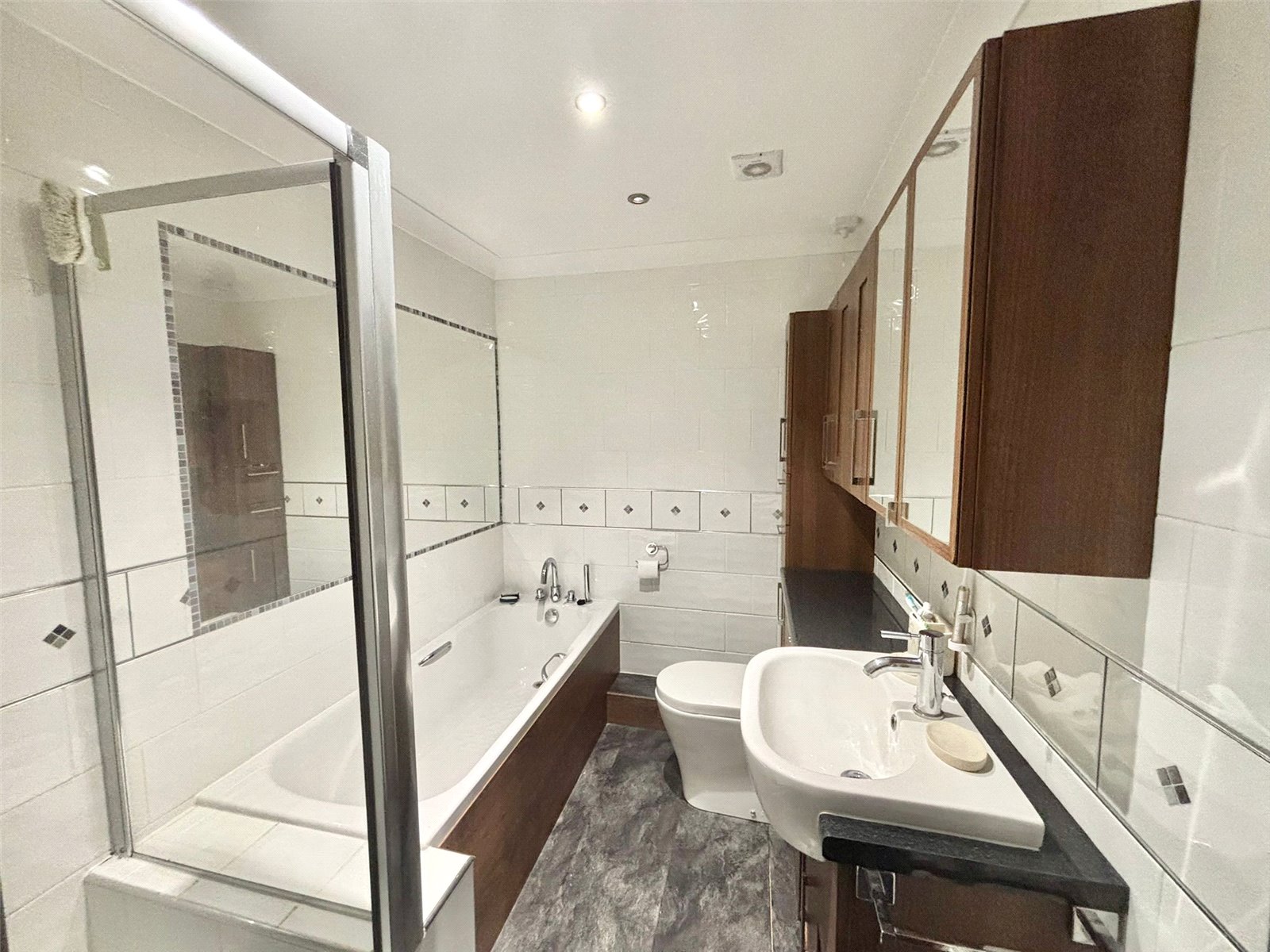 This well-appointed second-floor family bathroom offers both comfort and convenience. It features a modern white three-piece suite, comprising a panelled bath with an overhead shower and glass screen, a low-level WC, and a pedestal washbasin. Dark wood-effect vanity units provide excellent storage, complemented by a dark countertop. The room is finished with light-colored wall tiling, featuring a decorative border, and a contrasting dark grey floor, creating a sophisticated and practical space. A large mirror enhances the sense of space, reflecting the light and modern fittings.