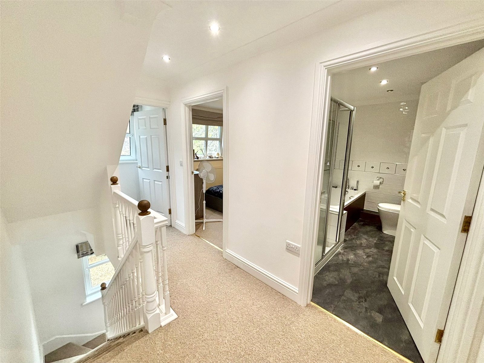 This private en-suite, conveniently located off the master bedroom, offers a compact yet complete bathing solution. It features a modern white suite, including a washbasin, WC, and a walk-in shower cubicle. The room is fully tiled in crisp white, enhancing the sense of space and cleanliness, while a Velux window provides natural light. This functional en-suite ensures ultimate convenience and privacy for the master occupants.