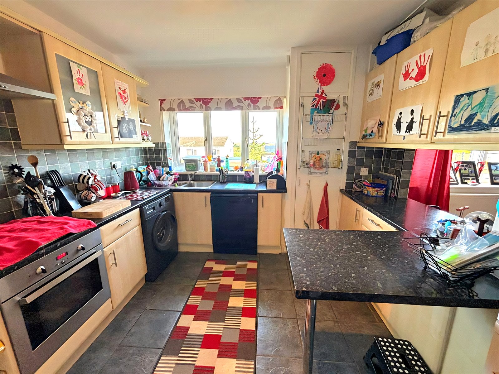This modern kitchen offers a practical and inviting space. The room features light wood-effect cabinetry with ample storage, complemented by dark, speckled countertops and a tiled backsplash. The layout includes a breakfast bar with a chrome leg, providing an informal dining or preparation area. Integrated appliances include an oven, microwave, and washing machine, while the large window above the double sink fills the space with natural light. The grey tiled floor is both stylish and durable. The room is decorated with a personal touch, showcasing colorful children's artwork and family photos.
