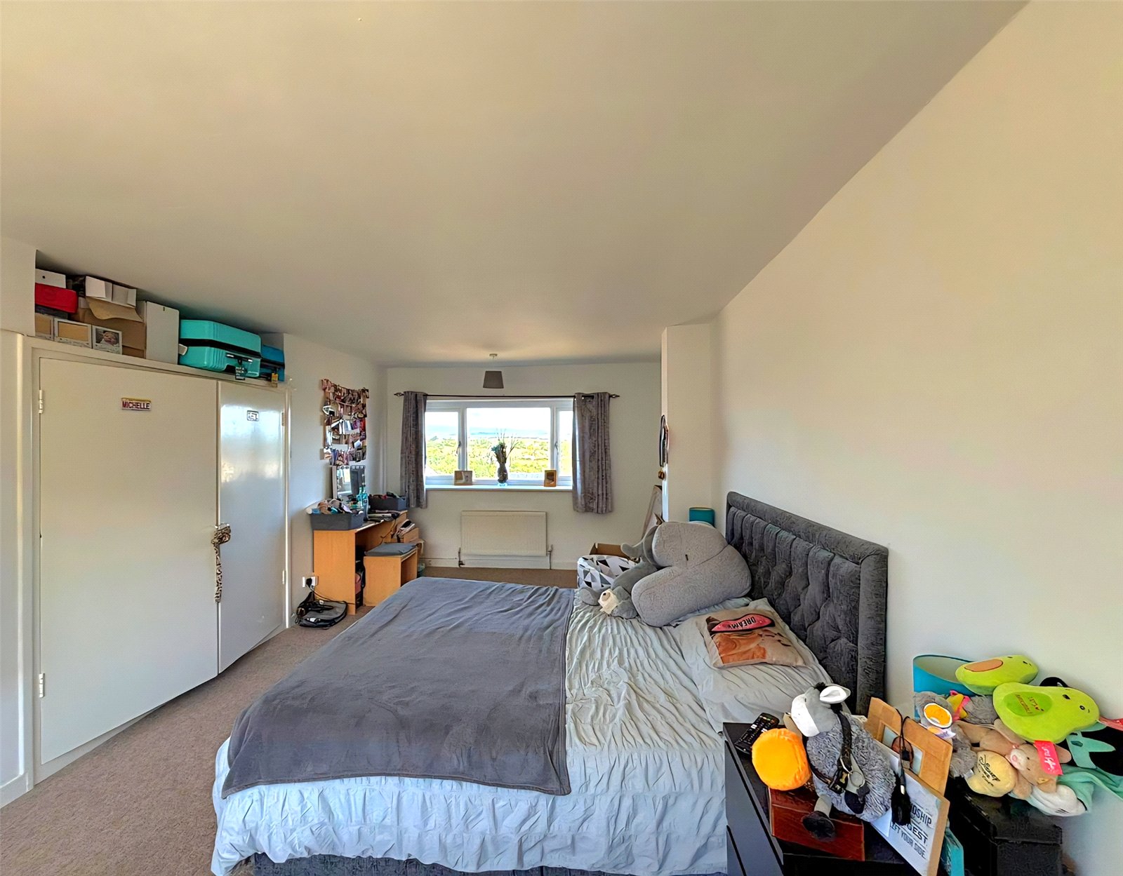 This bright and spacious double bedroom offers a comfortable and airy feel. The room features a large window that provides excellent natural light and views of the surrounding landscape. The neutral decor, including a light-colored carpet and white walls, provides a versatile canvas for personalization. The room is large enough to accommodate a king-sized bed, bedside tables, and additional furnishings like a desk and a chest of drawers. Ample storage is provided by the built-in wardrobes, ensuring a tidy living space.